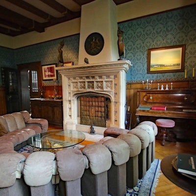 Der Boden im Obergeschoss ist mit Eichenparkett ausgelegt. Vor den zwei offenen Kaminen hat Schmidt-Holzmann Fliesen verlegen lassen, sie stammen aus dem Gebäude. Klinker, die ins Parkett eingelassen sind, deuten an, dass der hintere Raum in früherer Zeit aus drei kleineren Zimmern bestanden haben muss.