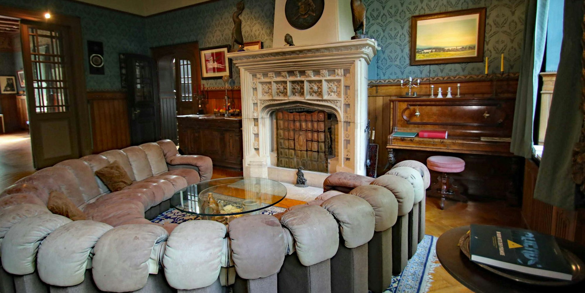 Ein ausladende Sitzgruppe steht vor dem englischen Sandsteinkamin, der auch in Touristikführern Erwähnung findet.