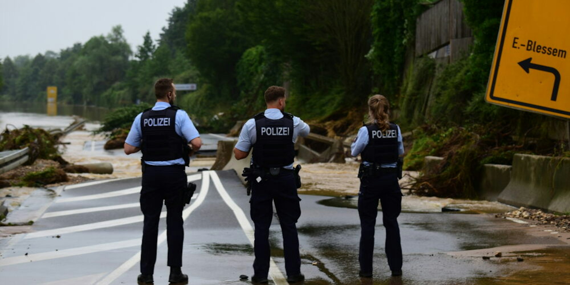 Die Polizei im Einsatz auf der Bundesstraße 265 bei Erftstadt-Blessem nach der Flutwelle im Juli.