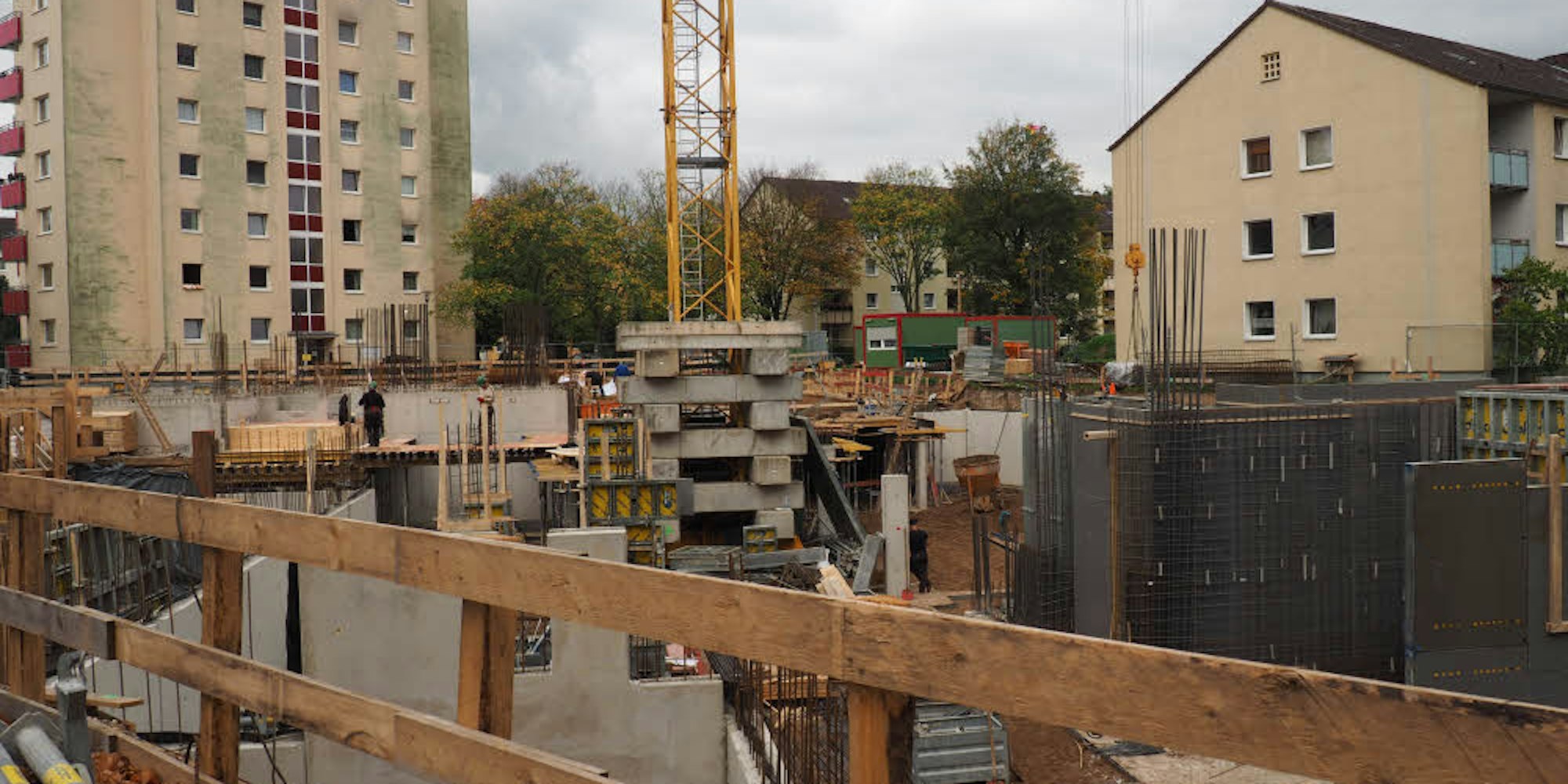 An der Friedrich-Ebert-Straße/Ecke Masurenstraße wird kräftig gearbeitet. Auf dem Grundstück entstehen zwei Häuser mit 38 Mietwohnungen.