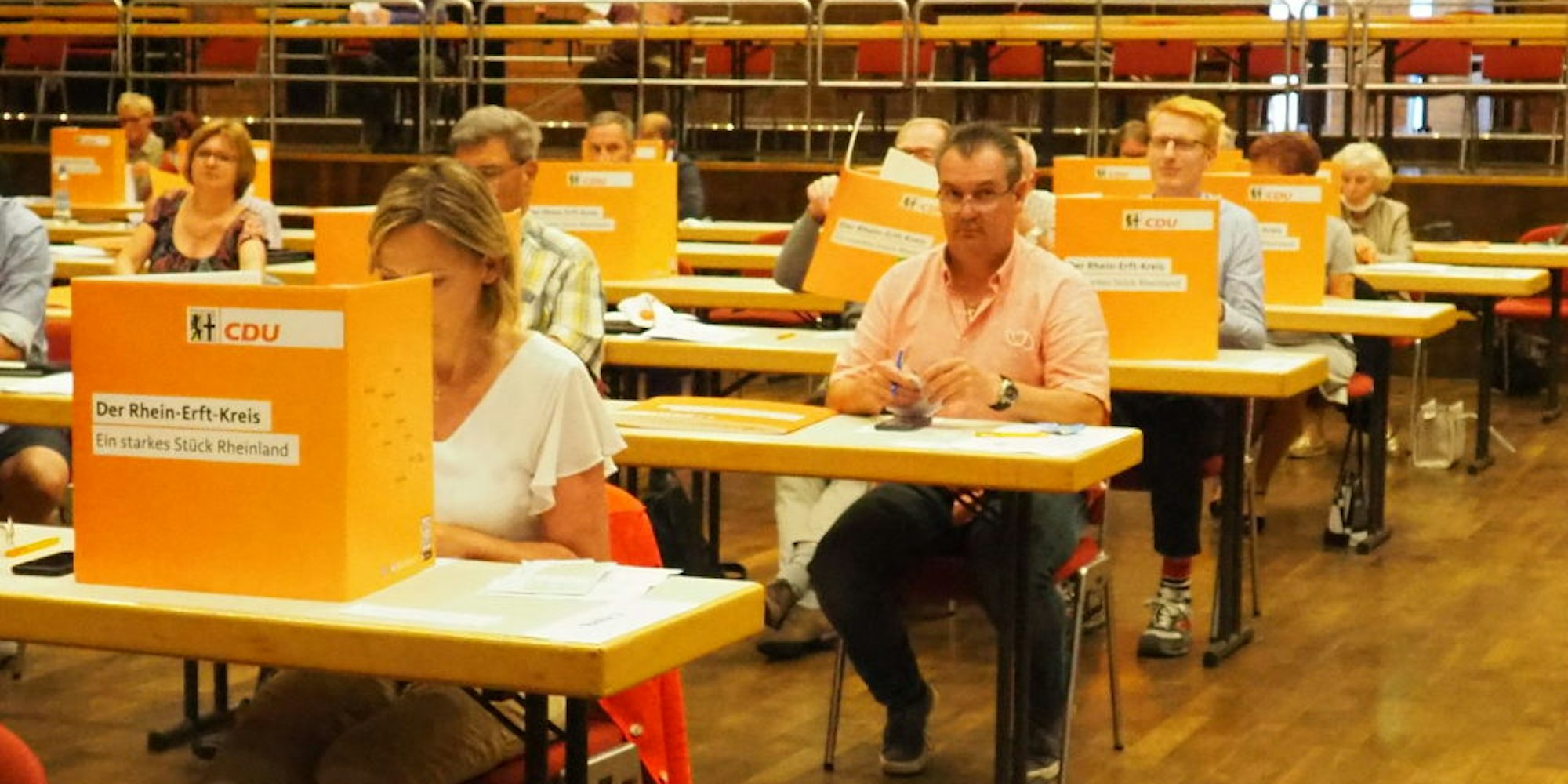 Um den Corona-Bestimmungen Genüge zu tun, fand die Versammlung, auf der auch die Kandidaten für den Stadtrat aufgestellt wurden, im Köster-Saal statt. Jeder musste sich anmelden und bekam einen Platz zugewiesen, damit die Abstände eingehalten wurden. Statt Wahlkabinen, in die einer nach dem anderen gegangen wäre, hatte jeder eine Tischwahlkabine an seinem Platz: eine Konstruktion aus orangefarbener Pappe, die dem Nachbarn den Blick aufs Kreuzchen verwehrt und die geheime Wahl gewährleistet.