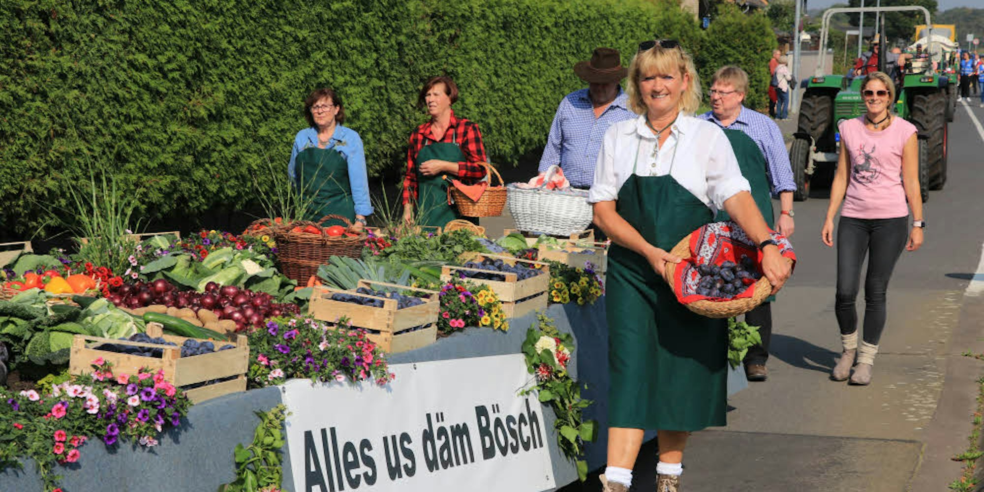 Viele Landwirte und Vereine beteiligten sich am Umzug durch Stommelerbusch. An die Zuschauer verteilt wurden Obst und Gemüse.