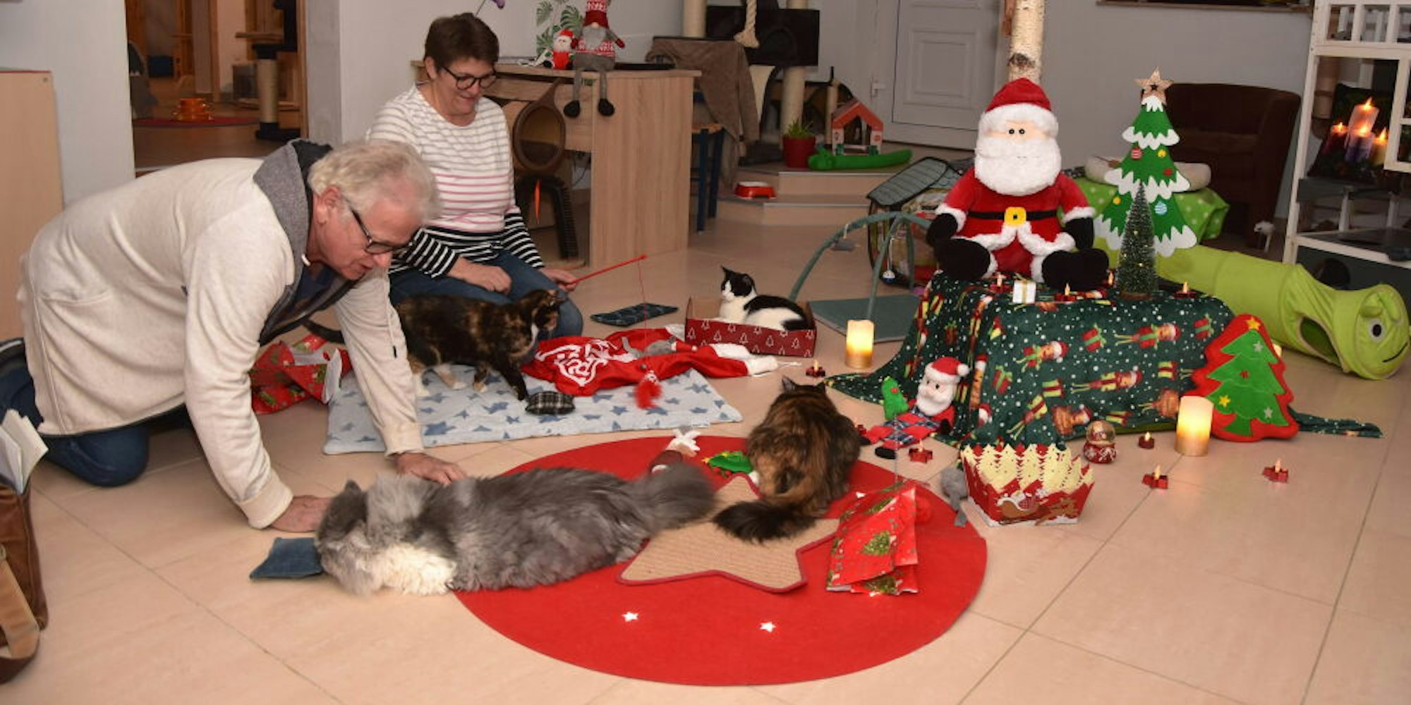 Für ihre Weihnachtsgäste hat Carmen Hoffmann die pfotenfreundlich kleinen Kissen genäht und gefüllt. Ihr Mann Peter hat die Katzenzimmer im Souterrain weihnachtlich dekoriert. Elektrische Kerzen leuchten, der Weihnachtsmann thront neben einem Tannenbaum, und um die Kletteräste sind bunten Lämpchen drapiert.