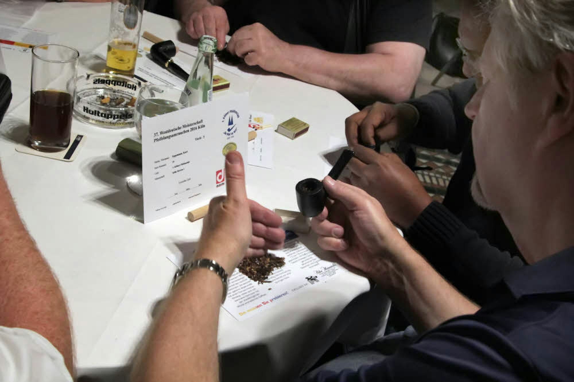 Eine Minute Zeit haben die Teilnehmer, um ihre sorgfältig mit exakt drei Gramm Tabak befüllten Wettkampfgeräte mit maximal zwei Streichhölzern in Gang zu bringen. „Den Tabak bröselt man möglichst gleichmäßig auf und stopft ihn dann in mehreren Lagen nicht zu fest und nicht zu locker in den Pfeifenkopf. Beim Zünden kommt es darauf an, die gesamte oberste Tabakschicht zum Glimmen zu bringen“, erklärt Greeven.