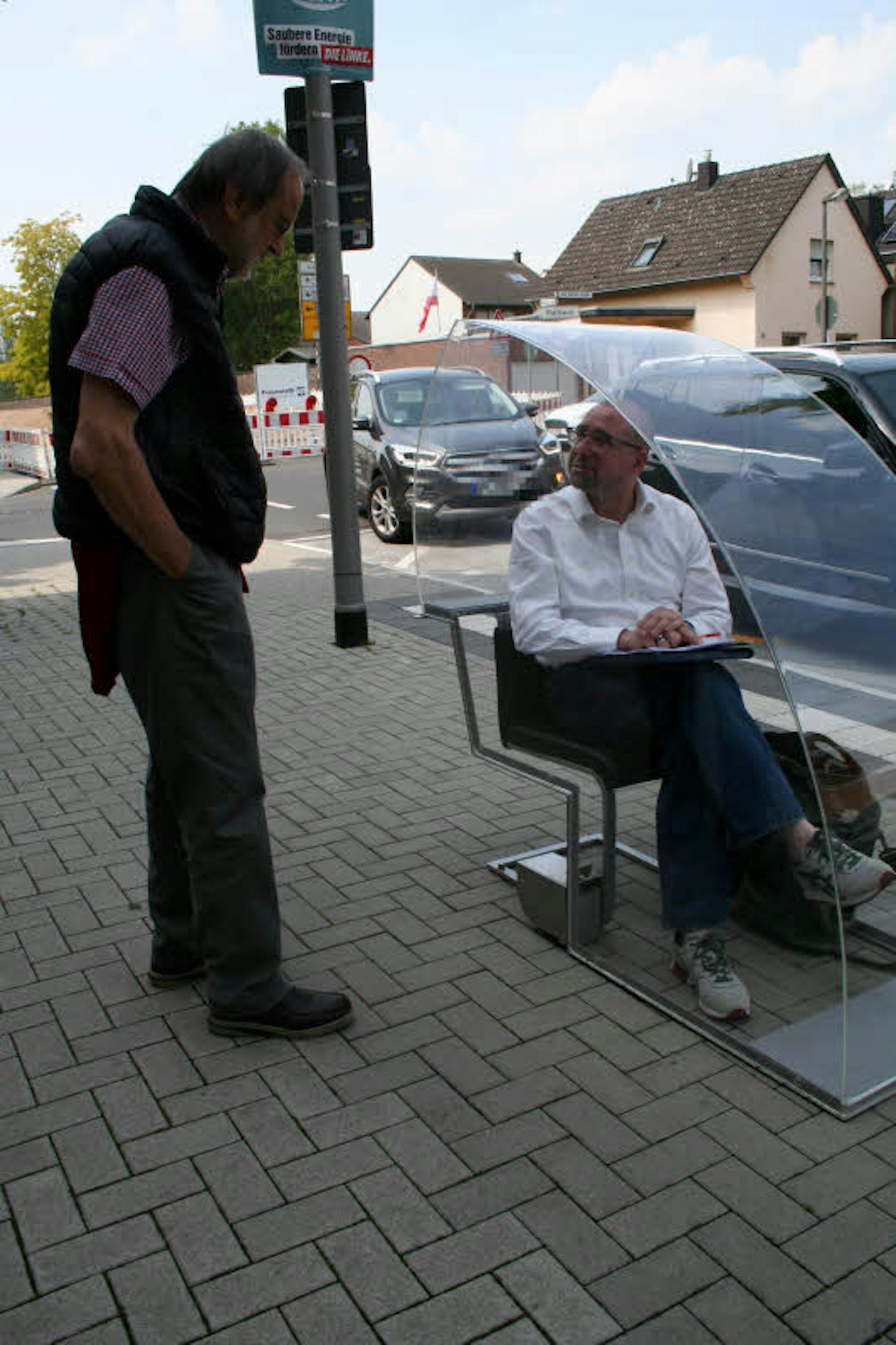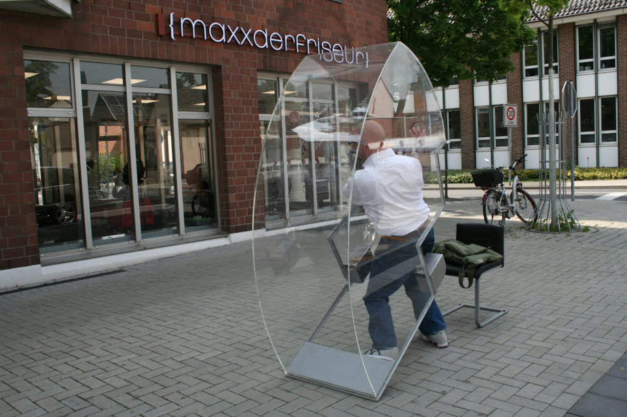 Den Vorläufer habe er für eine Aktion in Berlin so entworfen, dass die Kapsel auf eine Bank gestellt wurde. Im neuen Modell ist ein Stuhl, ein Freischwinger, integriert. In Düsseldorf und Heilbronn hat Hasucha den temporären Arbeitsplatz schon aufgestellt – auch, um zu sehen, ob Menschen in unterschiedlichen Städten auch unterschiedlich reagieren.