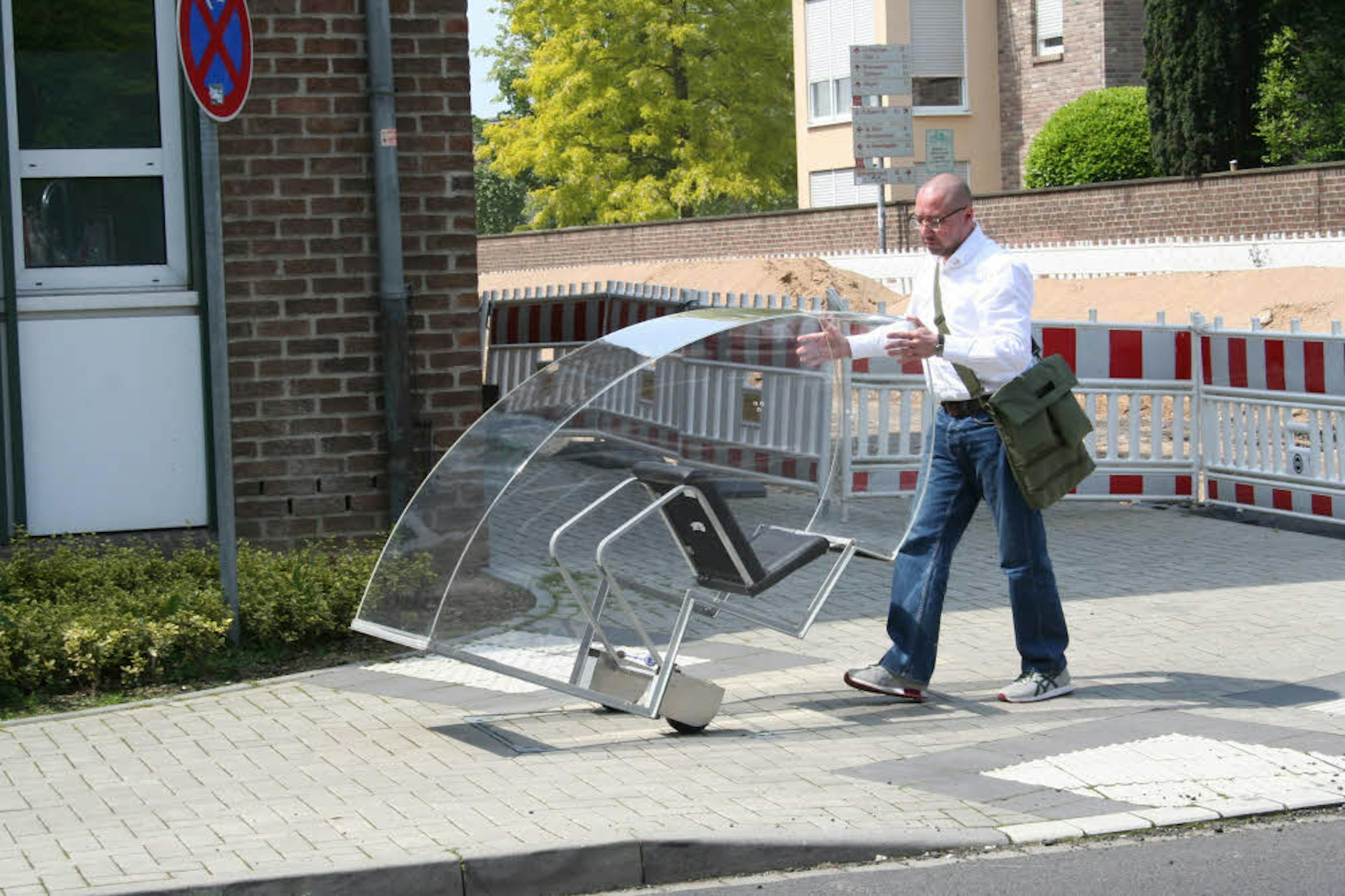 Mit ein paar Handgriffen befestigt er den Stuhl im Innern, dann schiebt er die Kapsel problemlos durch die Stadt. Hasucha hat einen Lieferwagen trickreich ausgerüstet. Eine Rampe wird angelegt, die Monozelle in den Laderaum geschoben, festgezurrt, die Rampe eingeladen. Fertig. Mittagspause. Um 14 Uhr geht es an einem anderen Stadtort weiter. Dass er wie auf dem Präsentierteller sitzt, stört Carsten Weber nicht. „Ich bin geschützt und gleichzeitig exponiert“, sagt er.