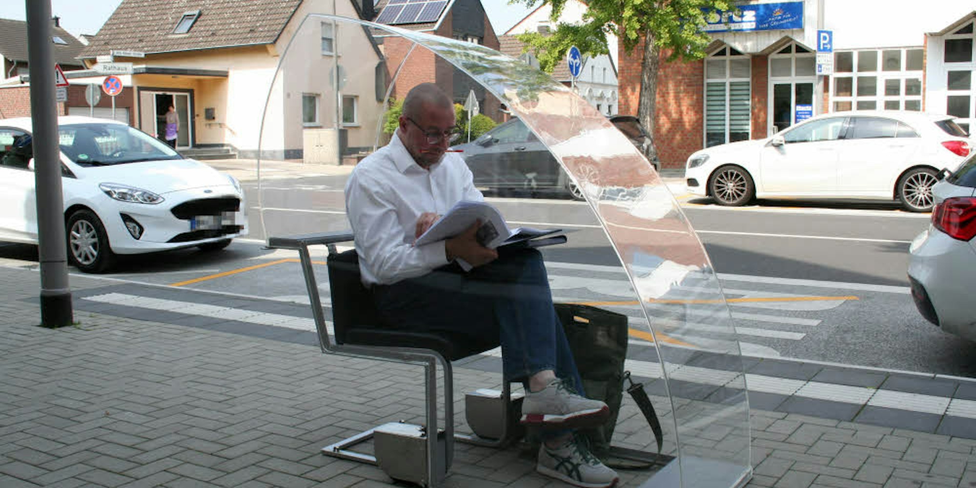 Pulheim – Wer im knapp bemessenen Großraumbüro sitzt und den Sonnenschein nur scheibchenweise durch die Jalousien sieht, könnte glatt neidisch werden auf diesen Arbeitsplatz. Carsten Weber sitzt ganz entspannt unter einer Haube aus Acrylglas. Mitten in der Pulheimer Innenstadt hat er ein schattiges Plätzchen gefunden. Nur gedämpft hört er die Geräusche der vorbeifahrenden Autos. Auf den Knien hat er ein Manuskript, in dem er liest, anstreicht, Randbemerkungen macht. Der Mann arbeitet tatsächlich hier auf dem Pulheimern Bürgersteig: Weber ist Lektor.