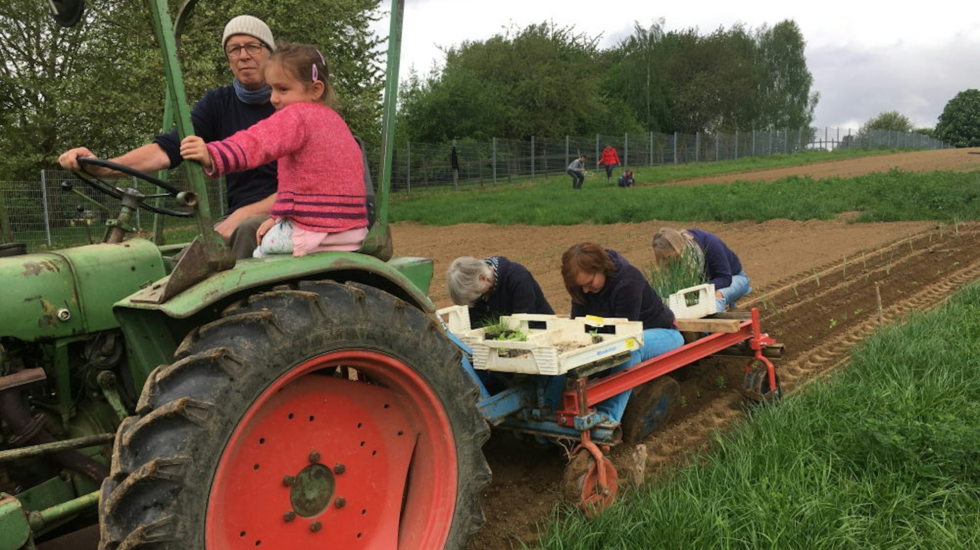 Reinhard Kamp (auf dem Traktor), Tanja Schlote und ein paar Helfer setzen Jungpflanzen auf dem Hellmese Hof.