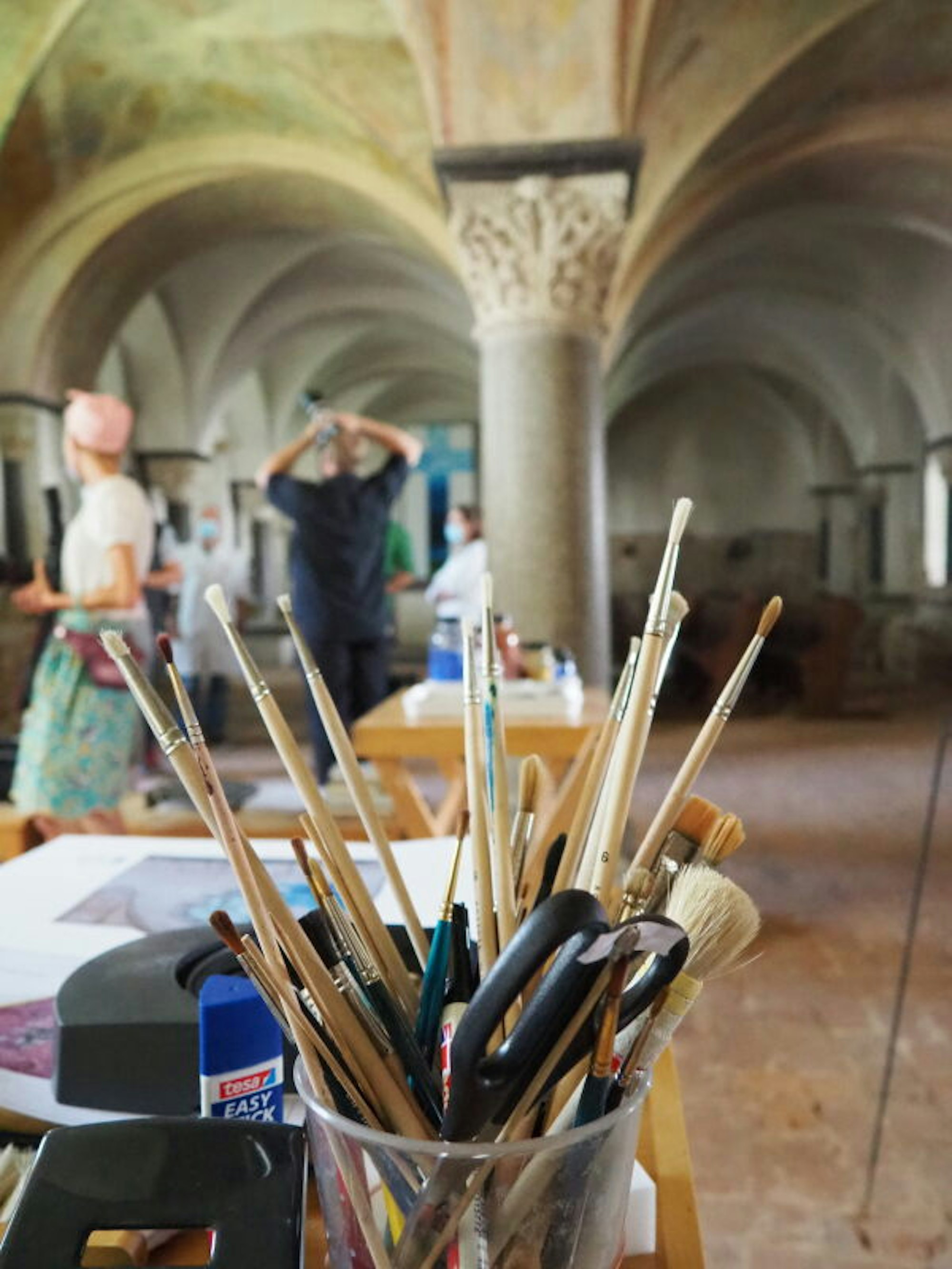 Heute ist der Weg ein anderer. Forschungsrestaurierung nennt man es: Die Malereien sollen in ihrer Substanz gesichert werden, sie werden gereinigt und dadurch höchstwahrscheinlich wieder etwas mehr Strahlkraft bekommen, neu ausgemalt werden sie nicht. Die Risse in Gewölbe werden mit Kalkmörtel verfüllt, auch, damit die Spinnen weniger Unterschlupf finden.