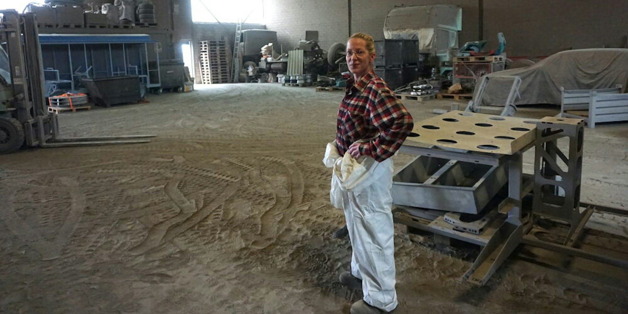 Morgens um 7 Uhr sitzt Jennifer Fischer mit Latzhose, kariertem Hemd, Sicherheitsschuhen und mit um die Taille geknotetem Overall im kleinen Büro und macht den Papierkram. Für die Arbeit in der Druckluftkammer muss sie sich in die volle Montur mit Schutzkleidung, Handschuhen und Helm werfen. Als Strahlgut dient Hochofenschlacke – echter Sand ist selten und viel zu teuer.
