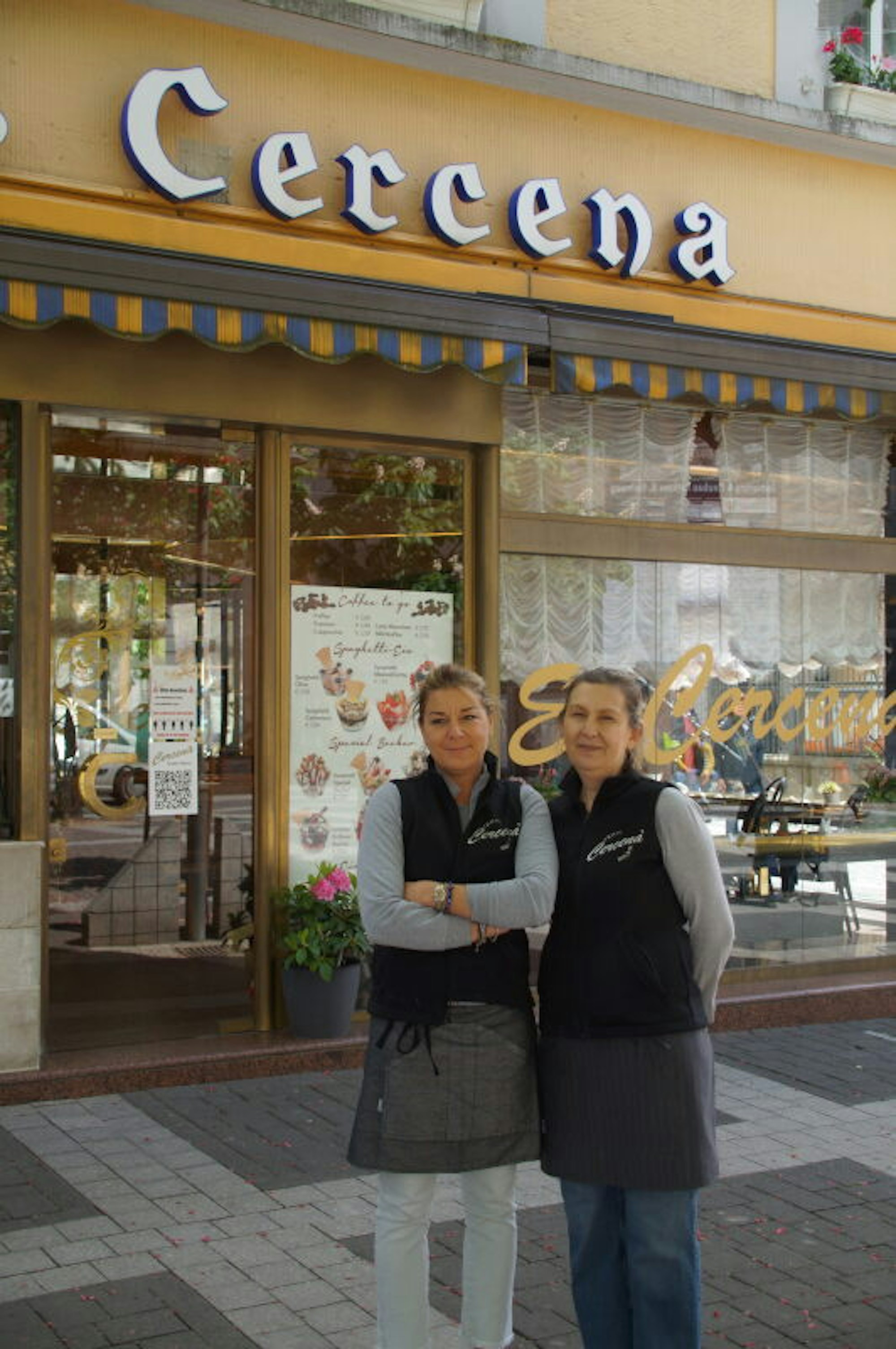 Vor dem Eiscafé Cercena in Brühl tut sich noch nichts. Liliana Cercena und Anastasia Gkori warten noch auf Informationen des Kreises.