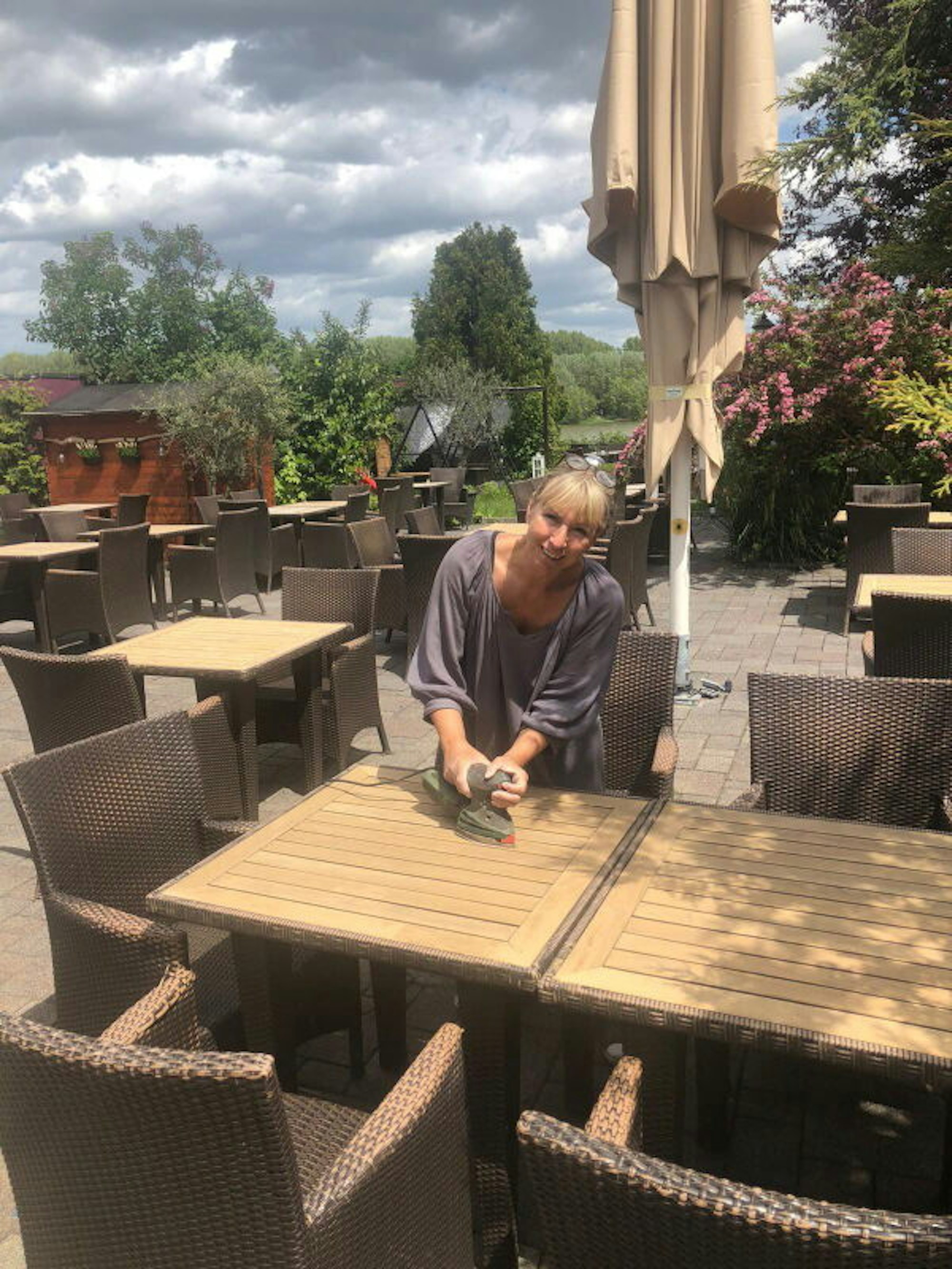 Beate Hellwig schleift die Tische vor der „Kulisse“ in Wesseling ab.