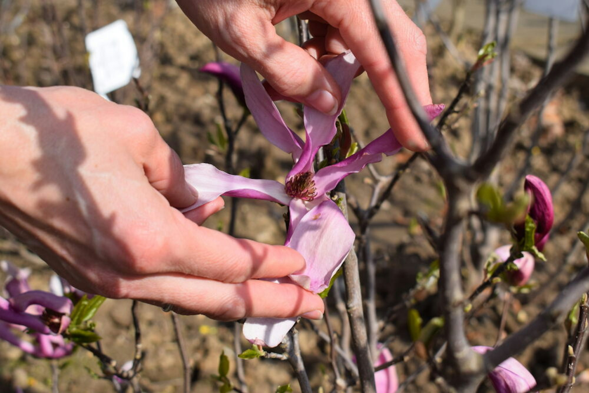 Anja Specht-Pitz mit der „dunklen Schönen“, der Magnolie Susan.