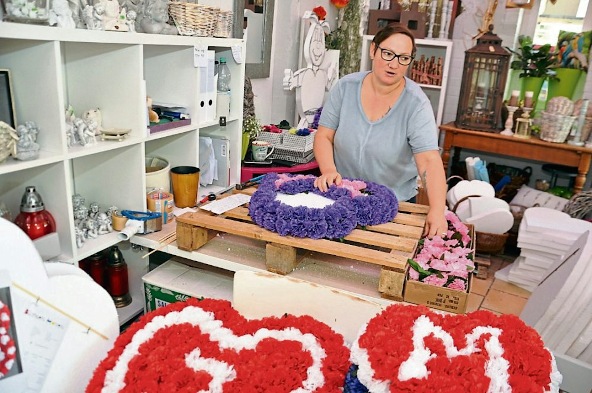 Linda Keller hat zurzeit alle Hände voll zu tun, um im Blumenhaus Hoven in Glessen die bestellten Maiherzen herzustellen.