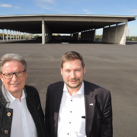 Jürgen Föhr und Thomas Schneemann überreichten symbolisch einen überdimensionierten Zündschlüssel an Reinarz und Betriebsleiter Wolfgang Orth.