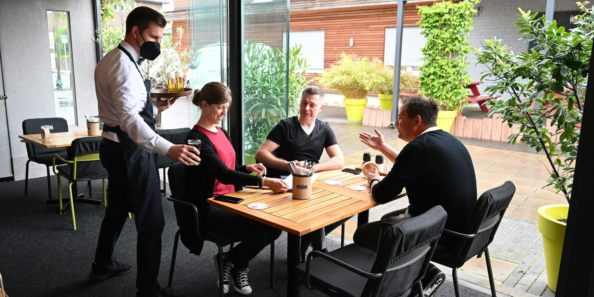 Draußen wieder öffnen durften Gastronomen. Im Restaurant „Haus Wilkens“ in Kerpen-Sindorf hatten sich für Mittag erste Gäste angemeldet. Und schon jetzt gebe es viele Reservierungen, berichtet Anne Schiffer, die am Empfang arbeitet. „Freitag und Samstag sind wir fast ausgebucht.“ Dennoch würden zunächst nur die Festangestellten arbeiten. Überlegt werde noch, wo Heizstrahler und Schirme aufgestellt werden könnten.