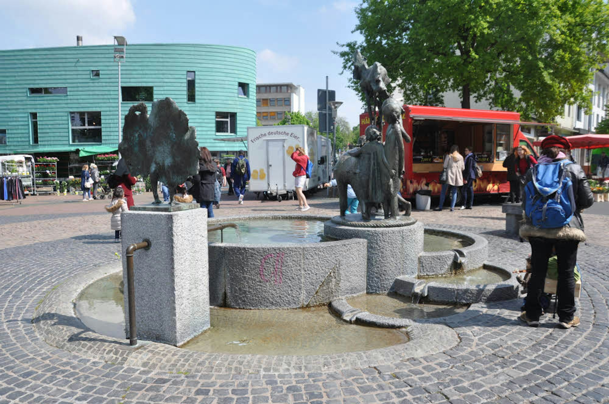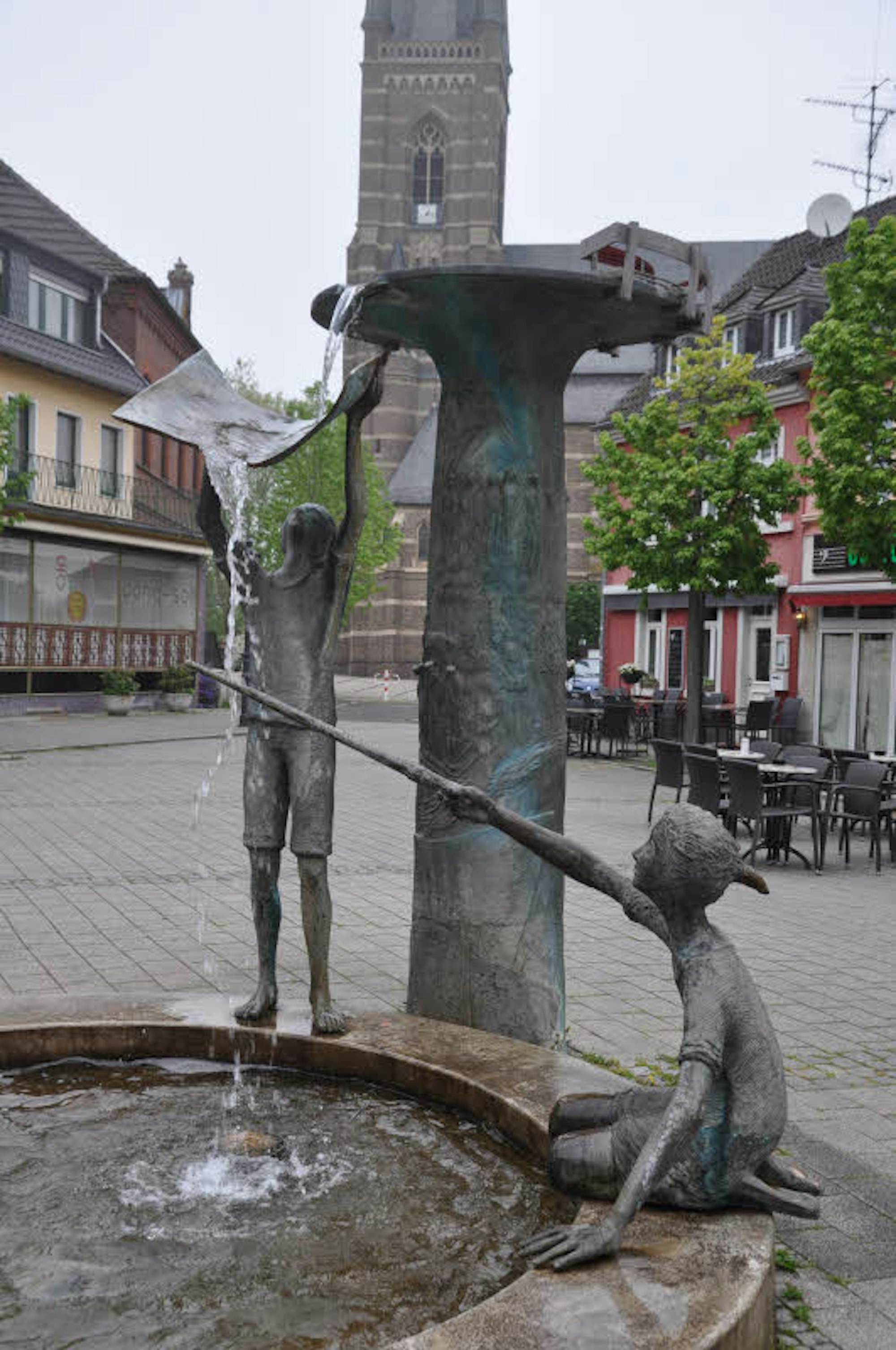 Auf dem Bedburger Marktplatz plätschert das Wasser aus einem originell gestalteten Brunnen des Künstlers Juan Fernandez, der den Titel „Geschichte, Kinder und Wasser“ trägt.