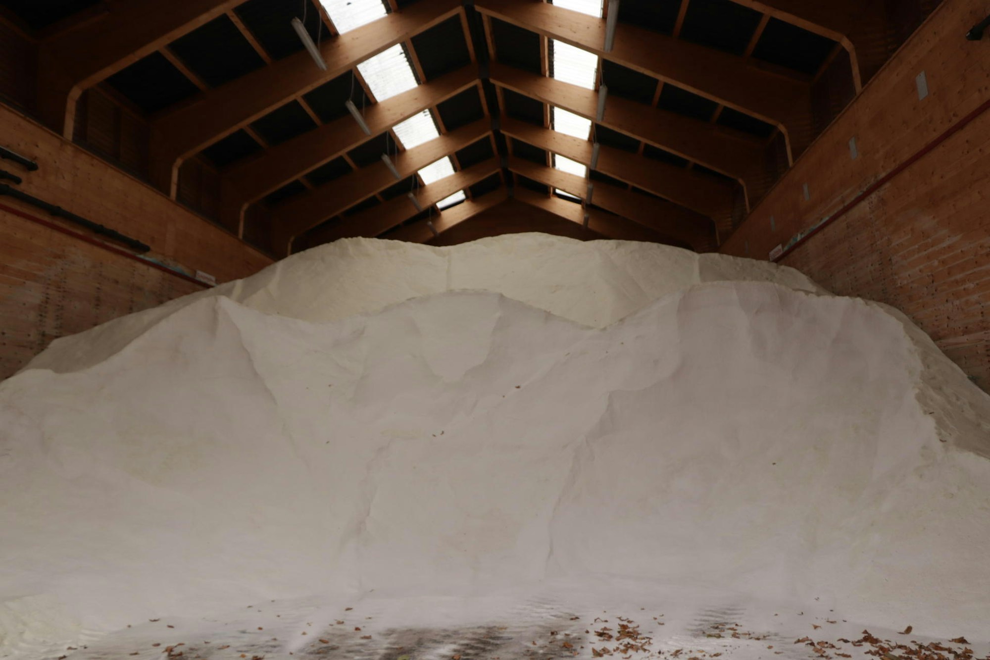 Bis unter den First in etwa sieben Metern Höhe ist das Salzdepot der Autobahnmeisterei in Weilerswist gefüllt.