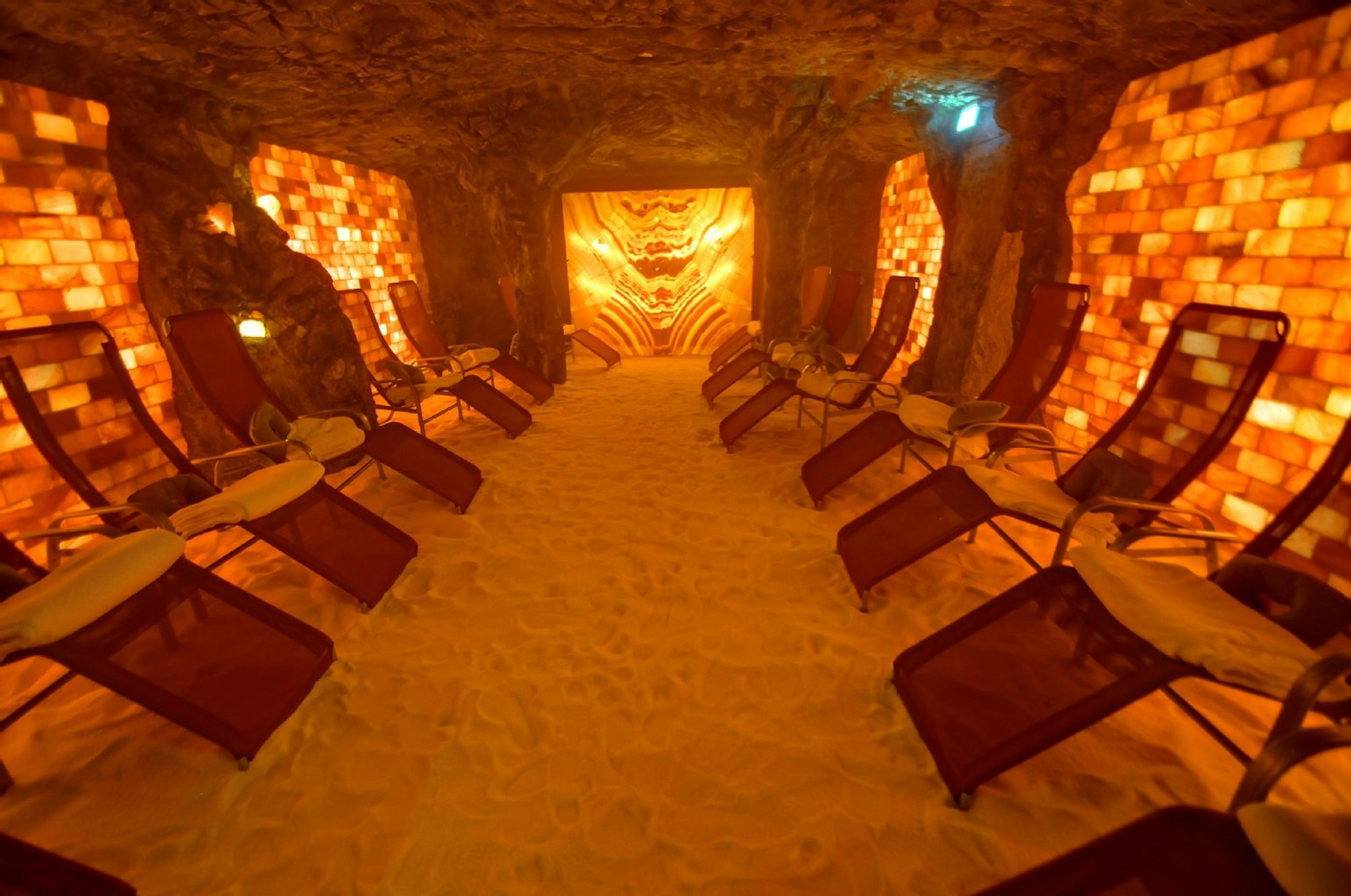 „Wellenwesen“ heißt die Salzgrotte, wo die Besucher bei gedimmtem Licht und Meeresrauschen frische Luft atmen, die mit Salz aus dem Himalaya getränkt ist. Neben den Liegestühlen und Sitzsäcken bullert ein Ofen. Die Luftfeuchtigkeit liegt bei 60 bis 75 Prozent, so soll das Immunsystem gestärkt werden. Vier Personen haben in der Grotte Platz.