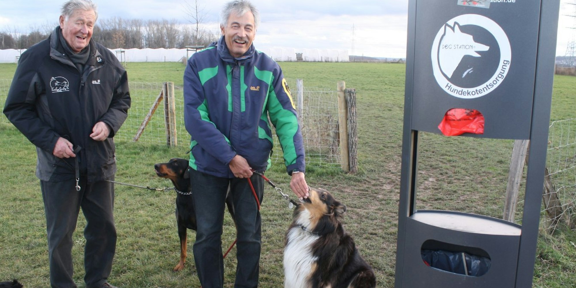 Heinz Rackwitz (l.) und Wolfgang Vogel ärgern sich über die Rattengift-Aufkleber (an der Hundestation ganz oben).