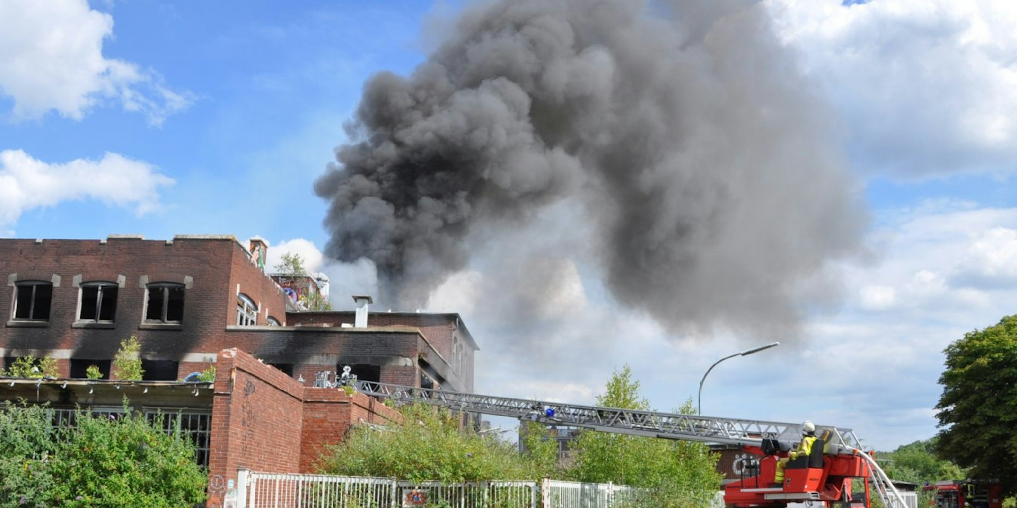 Wesseling – Nicht zum ersten und vermutlich auch nicht zum letzten Mal brannte es am Sonntagnachmittag auf dem ehemaligen Norton-Gelände in Wesseling an der Birkenstraße. Um kurz vor 16 Uhr gingen mehrere Notrufe bei der Feuerwehr ein, die daraufhin Stadtalarm auslöste und mit allen drei Löschzügen aus Urfeld, Berzdorf und Wesseling und mehr als 50 Einsatzkräften anrückte. Die vordere Seite des seit 1992 leerstehenden Backsteingebäudes stand bei Eintreffen der Wehren auf allen Etagen in Vollbrand, der allerdings schnell unter Kontrolle gebracht wurde. Trotzdem waren die Einsatzkräfte mit Atemschutz und unter Einsatz von zwei Drehleitern mehrere Stunden damit beschäftigt, alle Glutnester in dem weitläufigen Fabrikgebäude und auf dem Dach von außen zu löschen. Denn in die baufällige Halle wollte Einsatzleiter André Bach seine Leute auf keinen Fall schicken. Für ihn ist die Industriebrache schon lange nicht nur ein Ärgernis sondern vor allem ein Gefahrenpunkt, nicht nur für Feuerwehrleute. Inzwischen sind Teile des Gebäudes einsturzgefährdet.