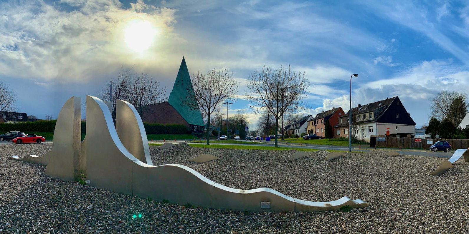Die Plastik „Rheinwellen“ von Wolfgang Göddertz bestimmt den Kreisverkehr am Mühlenweg/Hubertusstraße.