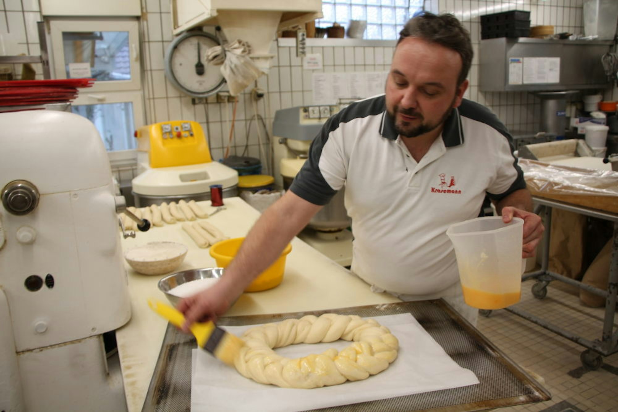 Bevor der Zopf gebacken wird, verpasst Frank Krasemann ihm einen Anstrich aus geschlagenem Ei.