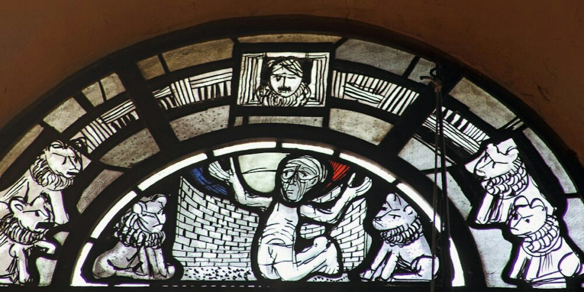 Adolf Hitler ist auf diesem Detail eines Fensters der Abteikirche St. Nikolaus zu sehen, das Konrad Adenauer gestiftet hat.