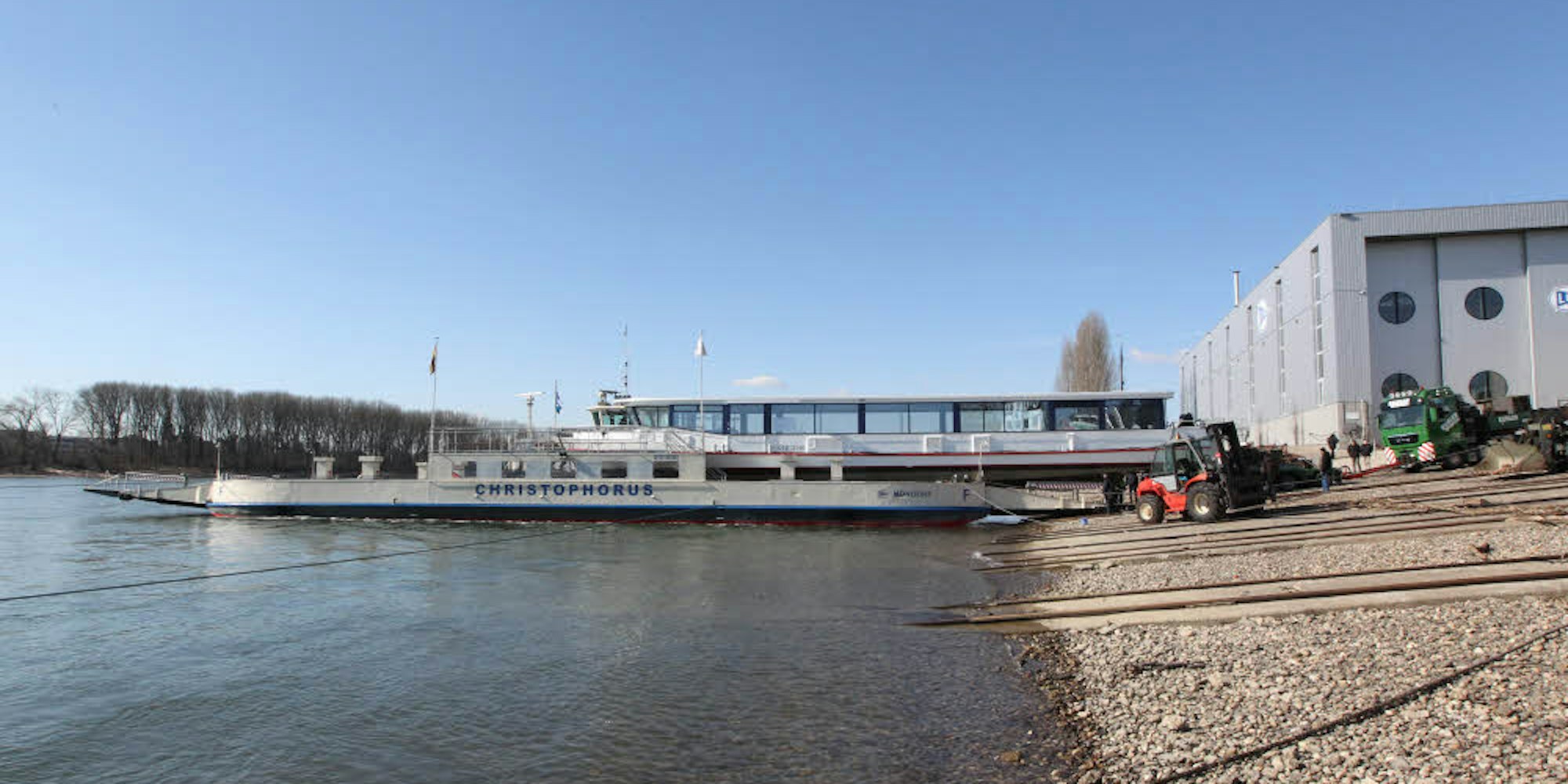 Rhein-Sieg-Kreis – Wo gibt es ein Schiff auf der Fähre? Dieser seltene Anblick hat sich am Dienstagnachmittag den Spaziergängern am Mondorfer Rheinufer geboten, als dort die für die Rursee-Schifffahrt bestimmte St. Nikolaus mit einem Tieflader auf die Fähre Christophorus verladen wurde.