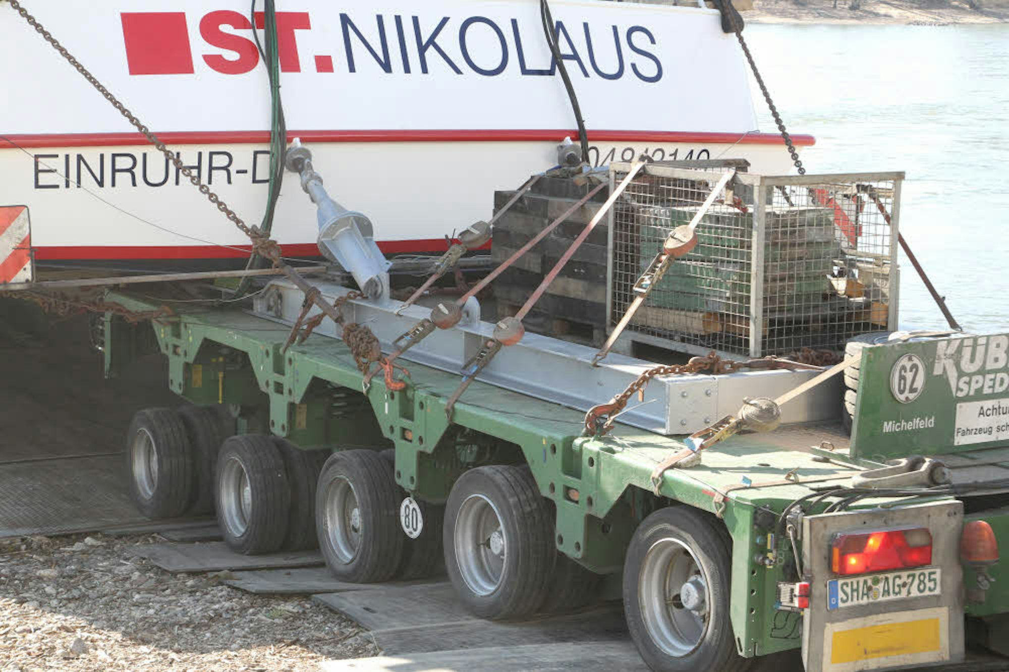 Das Manöver verlangte den Mitarbeitern der Lux-Werft und des Transportunternehmens Kübler-Spedition aus Michelfeld wahre Millimeter-Arbeit ab. Die neu gebaute, 72 Tonnen schwere St. Nikolaus misst in der Breite 7,20 Meter, die Christophorus der Lux-Werft hat eine Ladefläche von 7,40 Metern Breite. Somit waren auf jeder Seite zehn Zentimeter Platz – dementsprechend langsam schob die 680 PS starke Zugmaschine die Tiefladeeinrichtung auf das Transportschiff.