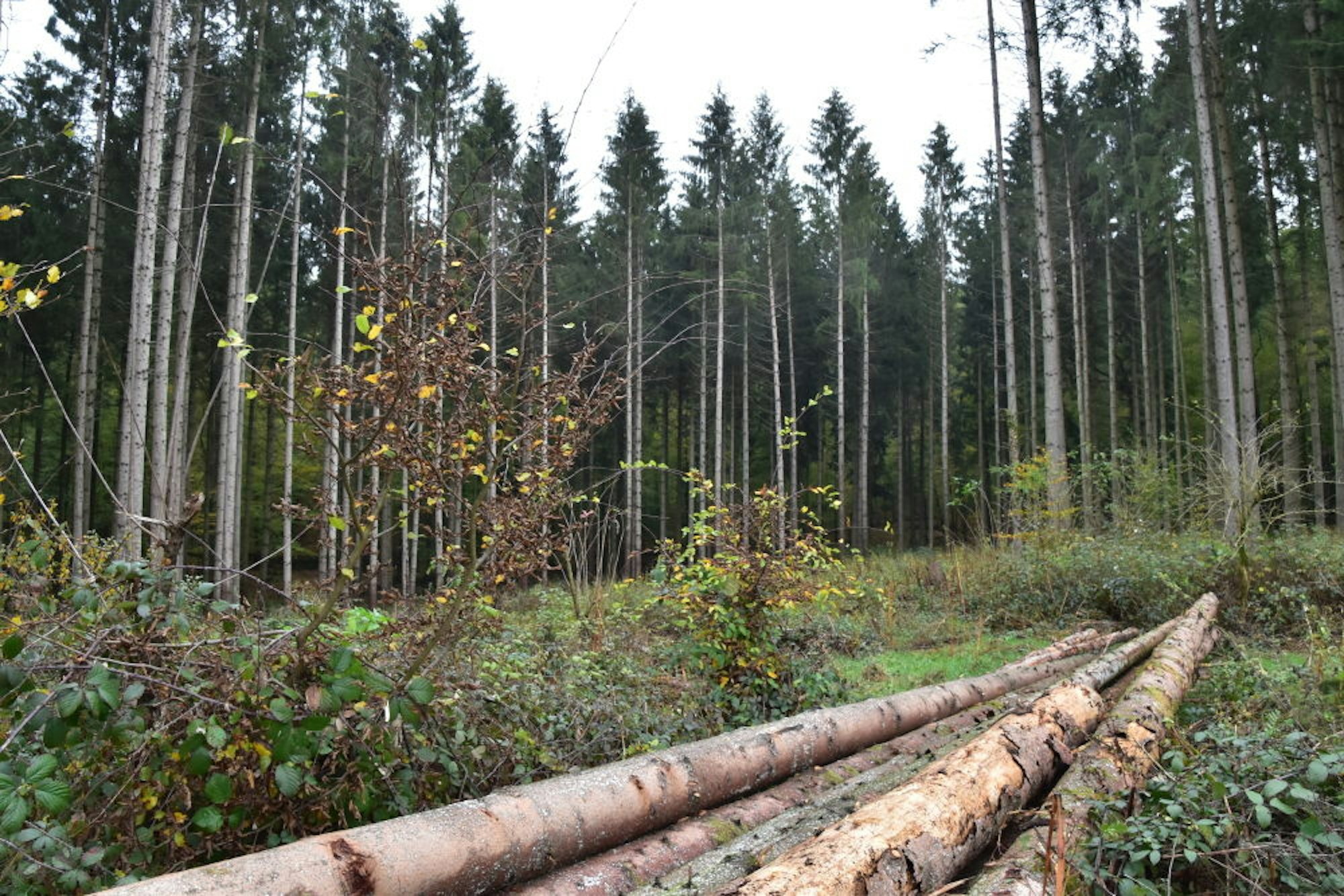 Dünn und geschädigt sind die Fichtenstämme, die gefällt und aus dem Wald abtransportiert werden müssen.
