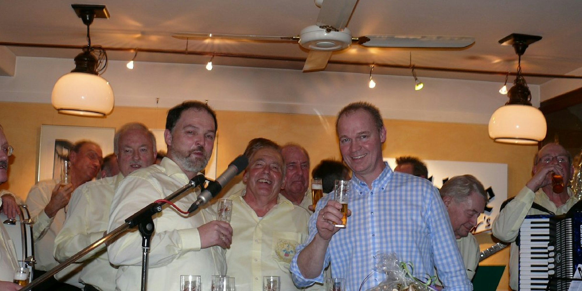 Ein Ständchen zum Jubiläum brachten die Overheder Hoffsänger dem Wirt Stefan Höller (im karierten Hemd).