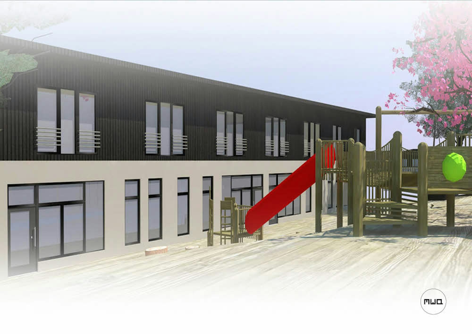 Geplant hat der Kölner Architekt Martin Willms auf dem Areal jetzt einen viergruppigen Kindergarten mit 70 Plätzen. Zwei Gruppen nähmen jeweils 20 Kinder im Alter zwischen zwei und sechs Jahren auf, eine sei für 20 Kinder über drei Jahren gedacht, eine weitere für zehn Kinder unter drei Jahren, berichtet Benedikt Kirfel. Die Kindertagesstätte erstreckt sich mit Gruppen-, Neben- und Sonderräumen über zwei Etagen, die mit einem Aufzug verbunden sind. Nach hinten entsteht ein großzügiges Freigelände, vorn sind Parkplätze für Mitarbeiter und Eltern geplant.