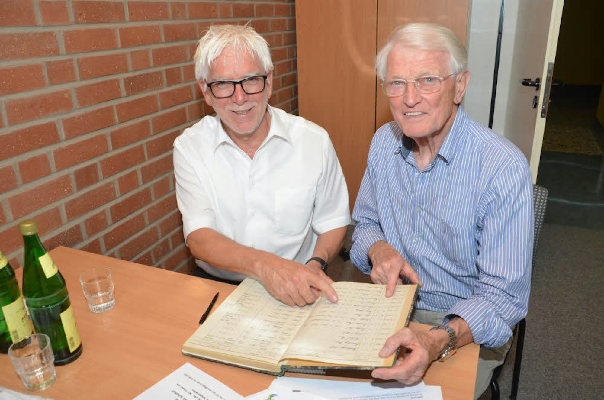 Schulleiter Friedhelm Schüller (l.) und sein Vorgänger Siegfried Westermann blättern in einer alten Kladde. Sie erinnern sich gern an ein Experiment, bei dem rund 500 Schüler mit Handspiegeln, Sonnenlicht und etwas Äther Strohballen entfachten.