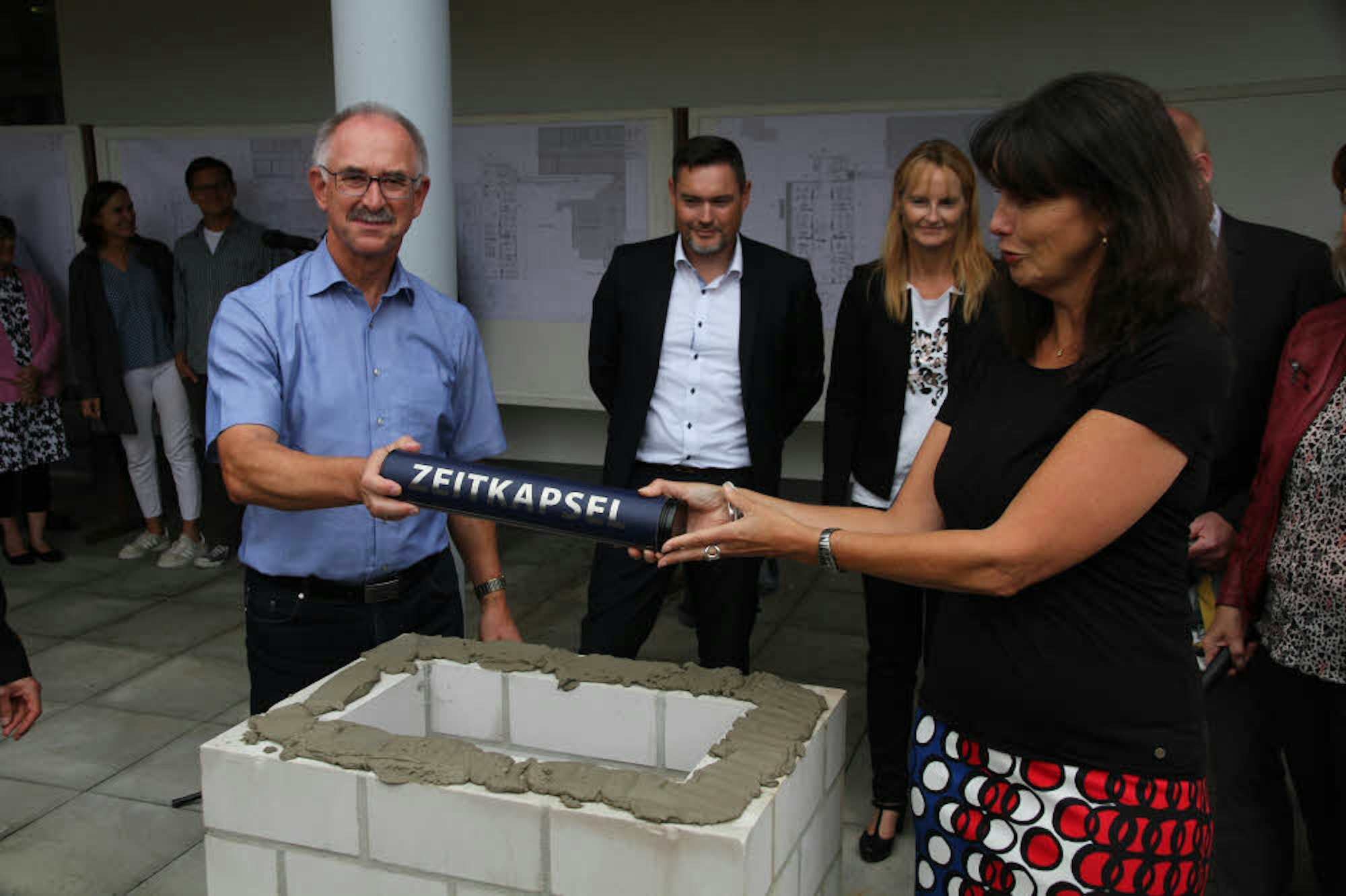 Bei der eigentlichen Grundsteinlegung wurde ein bisschen getrickst. Oberhalb der Baustelle mauerten Norbert Büscher und Andrea Friedrich eine Zeitkapsel mit einer Tageszeitung und weiteren Dokumenten in einen Steinsockel ein. Später wandert die Kapsel aber an eine andere Stelle im Neubau.