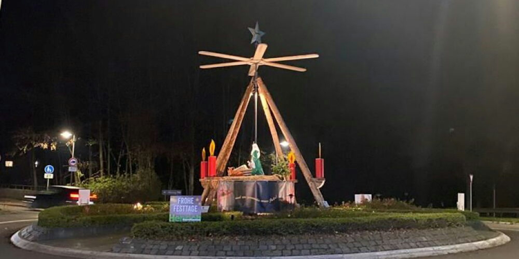 Das kunstvolle weihnachtliche Arrangement schmückt den Mucher Kreisel gegenüber der Burg Overbach im Wahnbachtal.