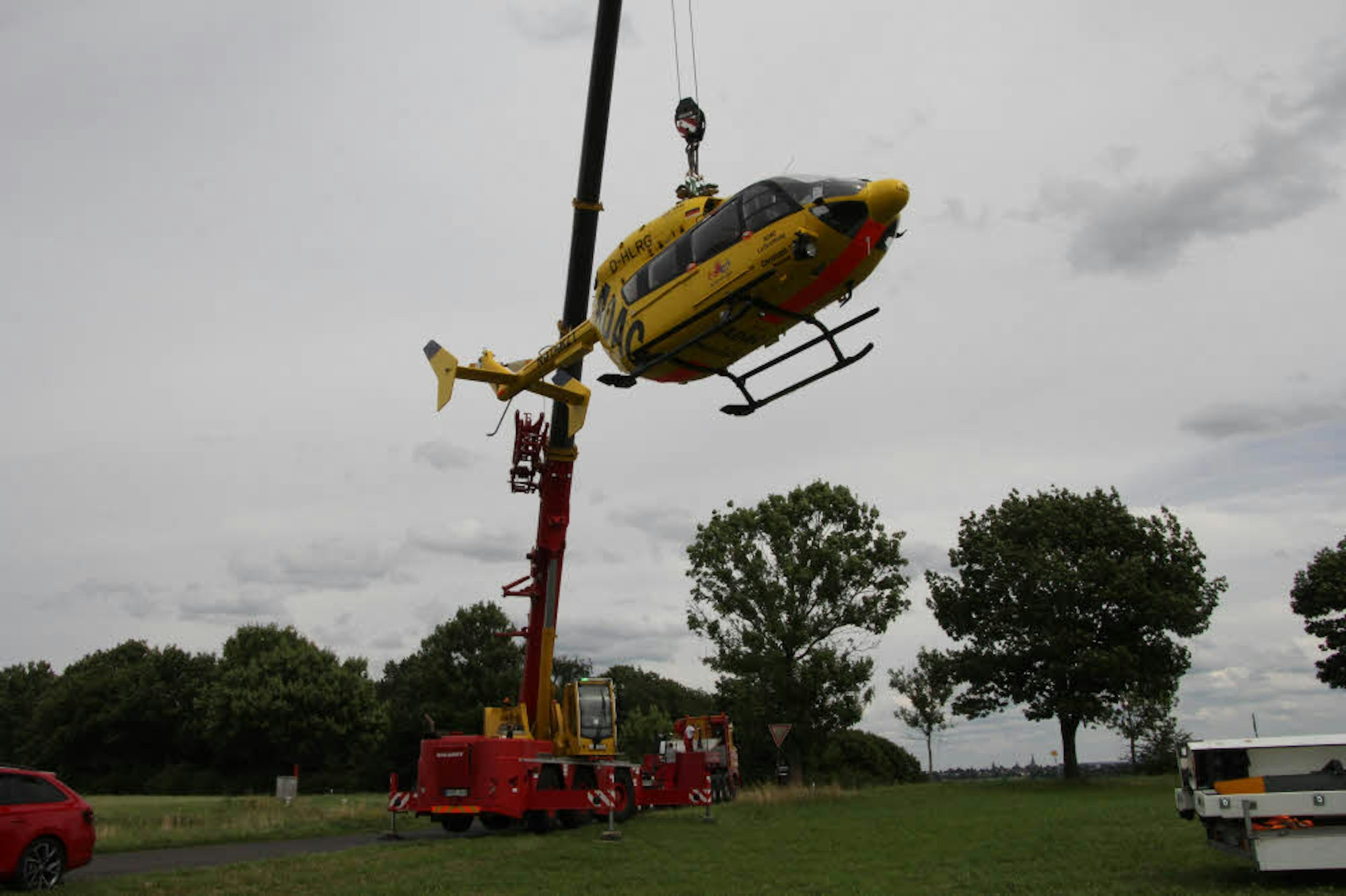 Der Rettungshubschrauber „Christoph Rheinland“ musste nach dem Kappen einer Stromleitung auf einen Tieflader gehoben werden.