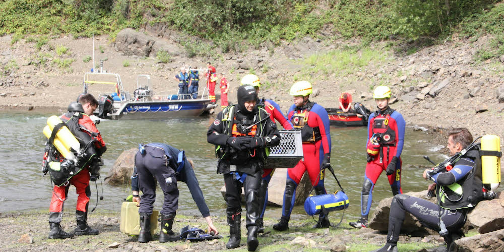 Um 9.23 Uhr lief die Alarmierung bei den Feuerwehr-Löschzügen Seelscheid und Neunkirchen auf. Einsatzleiter Roland Küpper war einer der ersten in Pinn und erkundete den schwer zugänglichen Uferstreifen. Parallel dazu eilten Polizei, Deutsche Lebensrettungsgesellschaft (DLRG) mit mehreren Tauchern und Strömungsrettern, die Wasserwacht des Deutschen Roten Kreuzes, das Technische Hilfswerk und die Wasserrettungsgruppe der Berufsfeuerwehr Köln zu dem Trinkwasser-Reservoir im Wahnbachtal.