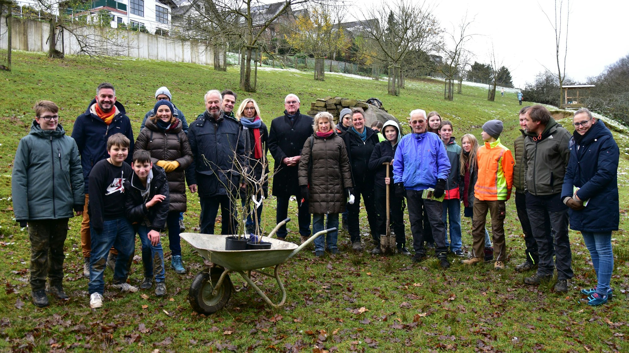 Beim Einweihungstermin konnten es die Kinder kaum erwarten, aktiv zu werden. Die Siebtklässler der Gesamtschule marschierten den Hang des Eischeider Tälchens hinauf, um zum Start die ersten drei Pflanzen einzusetzen und zu gießen; heimische Felsenbirne, Schneeball und Hundsrose sollen den Naturpark künftig verschönern.