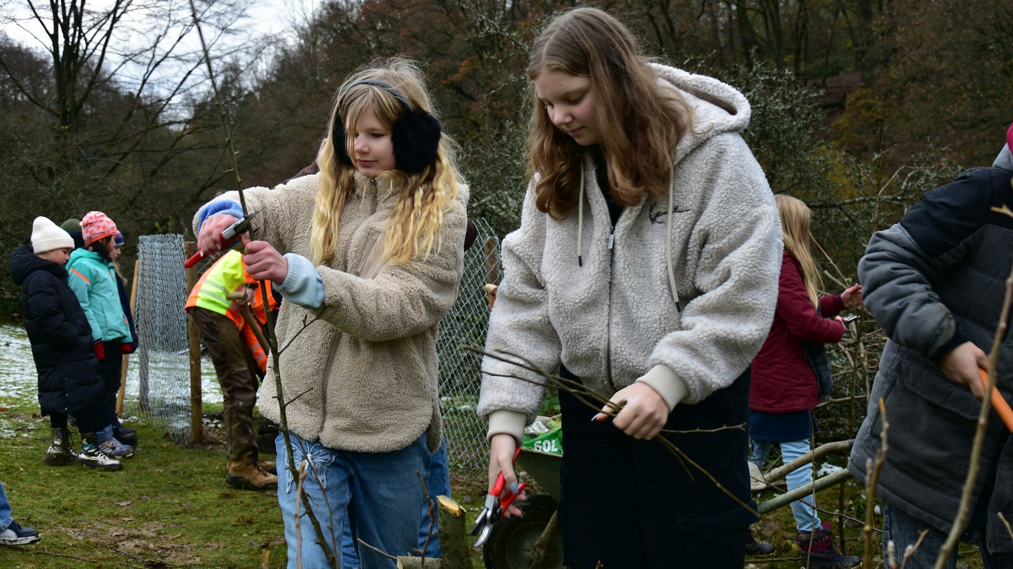 Die Pflanzen müssen allerdings eingezäunt werden, damit sie nicht von den 29 Soay-Schafen auf dem Gelände abgefressen werden. Die Tiere sollen die große Rasenfläche des Parks kurzhalten. Direkt daneben schneiden einige Mitschüler mit Gartenscheren und großen Astscheren Totholz zurecht, um die geplante Benjeshecke anzulegen.