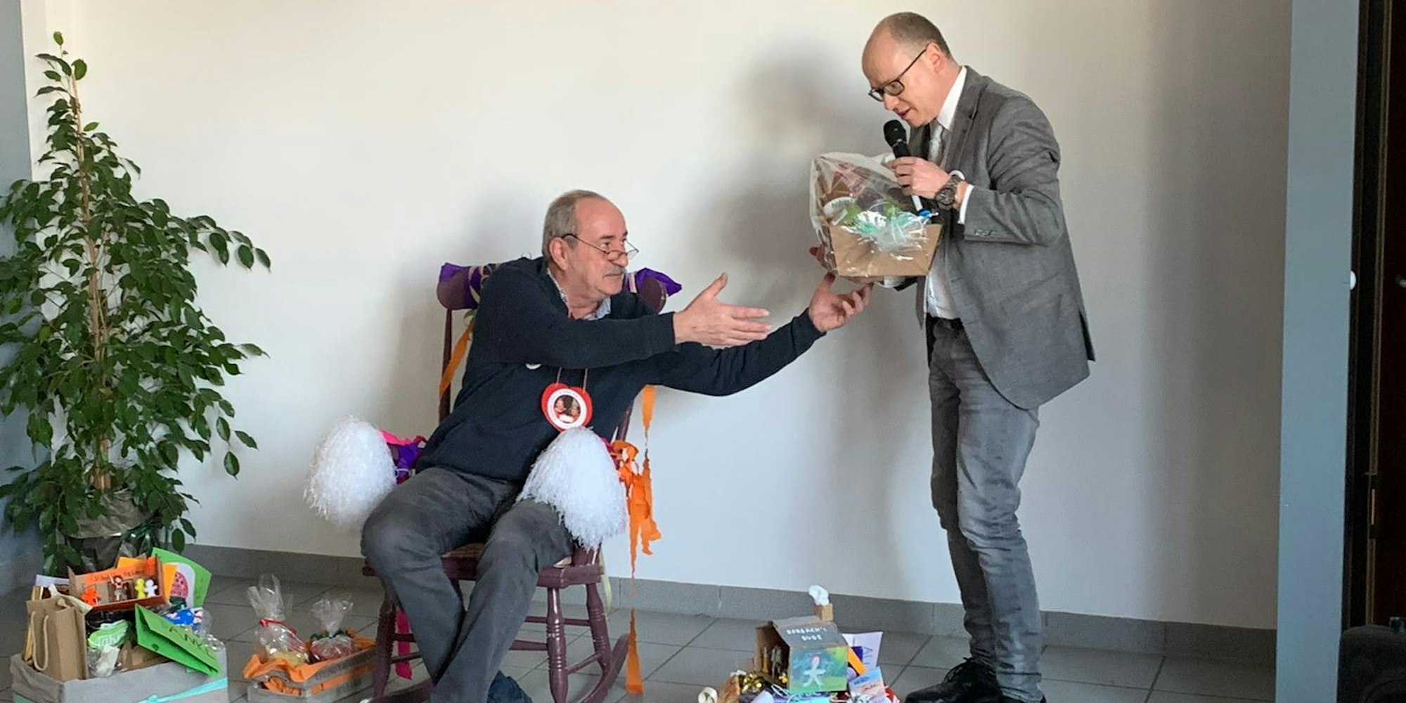 Der Bürgermeister Mario Loskill (r.) überreichte Helmut Horbach seine Geschenke.