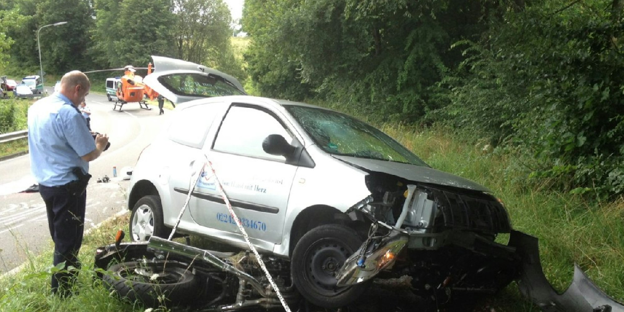 Ein Zeuge begann daraufhin sofort mit der Wiederbelebung des 60-Jährigen. Der Hubschrauber Christoph 3 traf als erster am Umfallort ein. Zwar bemühte sich der Notarzt um das Leben des Motorradfahrers, allerdings konnte er nach einer halben Stunde nur noch seinen Tod feststellen.