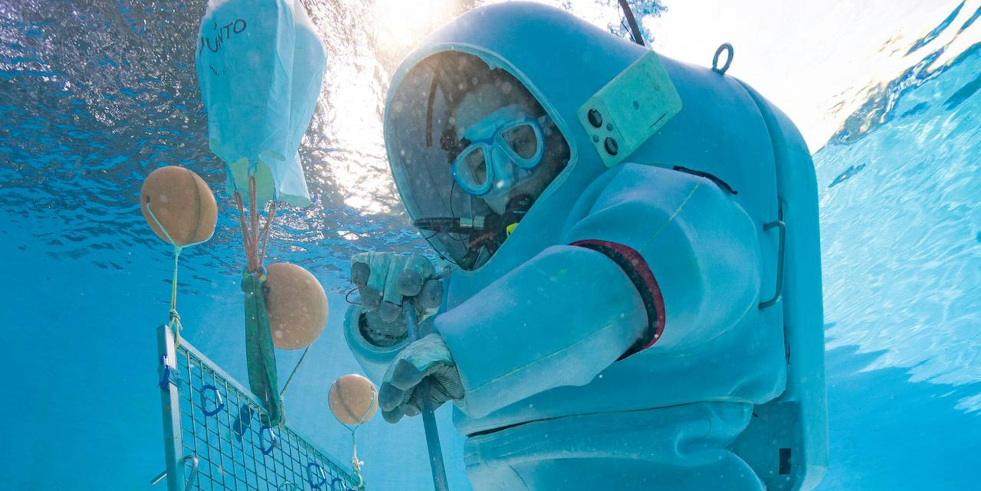 Unter Wasser simuliert Insa Thiele-Eich, wie sie Mondsandproben entnimmt.