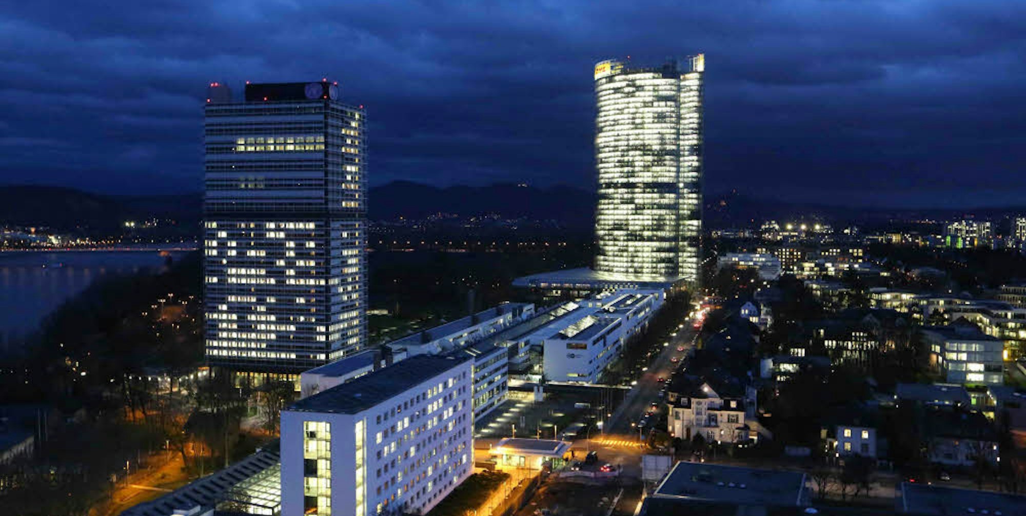 Beeindruckende Kulisse bei Nacht: Langer Eugen (l.), Posttower (hinten) mit Deutscher Welle zu seinen Füßen sowie das „Alte Abgeordnetenhochhaus“ (vorne).