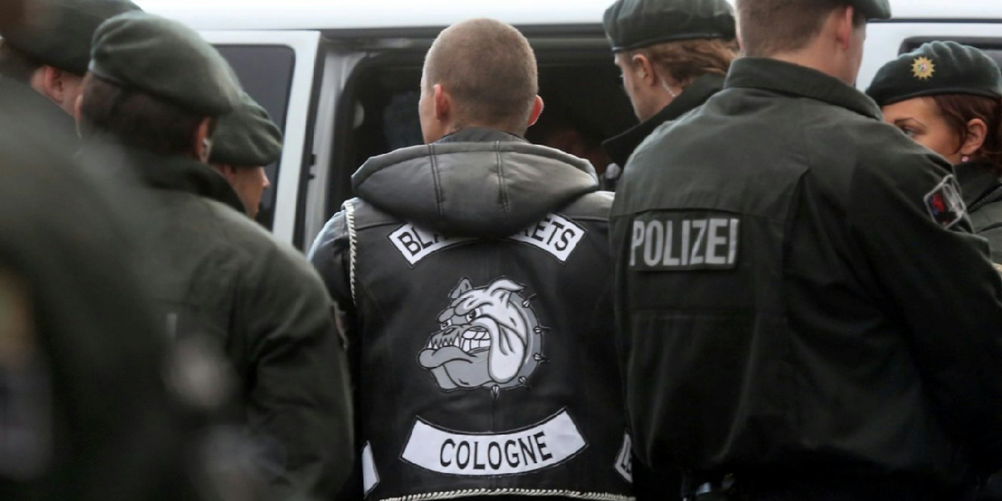 Die zähnefletschende Bulldogge ist das Markenzeichen der Black Jackets – hier ein Kölner Mitglied während einer Razzia im Mai.