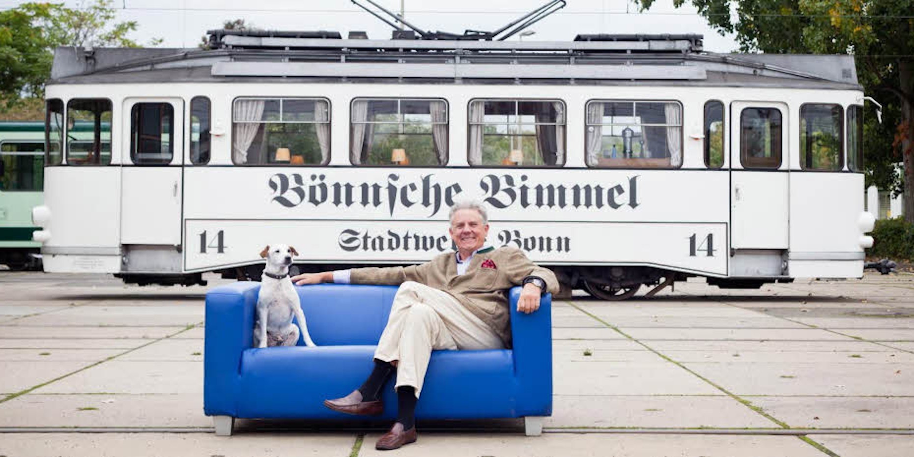 Hinter sich die Bönnsche Bimmel, neben sich Hund Milo: Bahnbetreiber Uli Hauschild auf der blauen Couch der Stadtwerke.