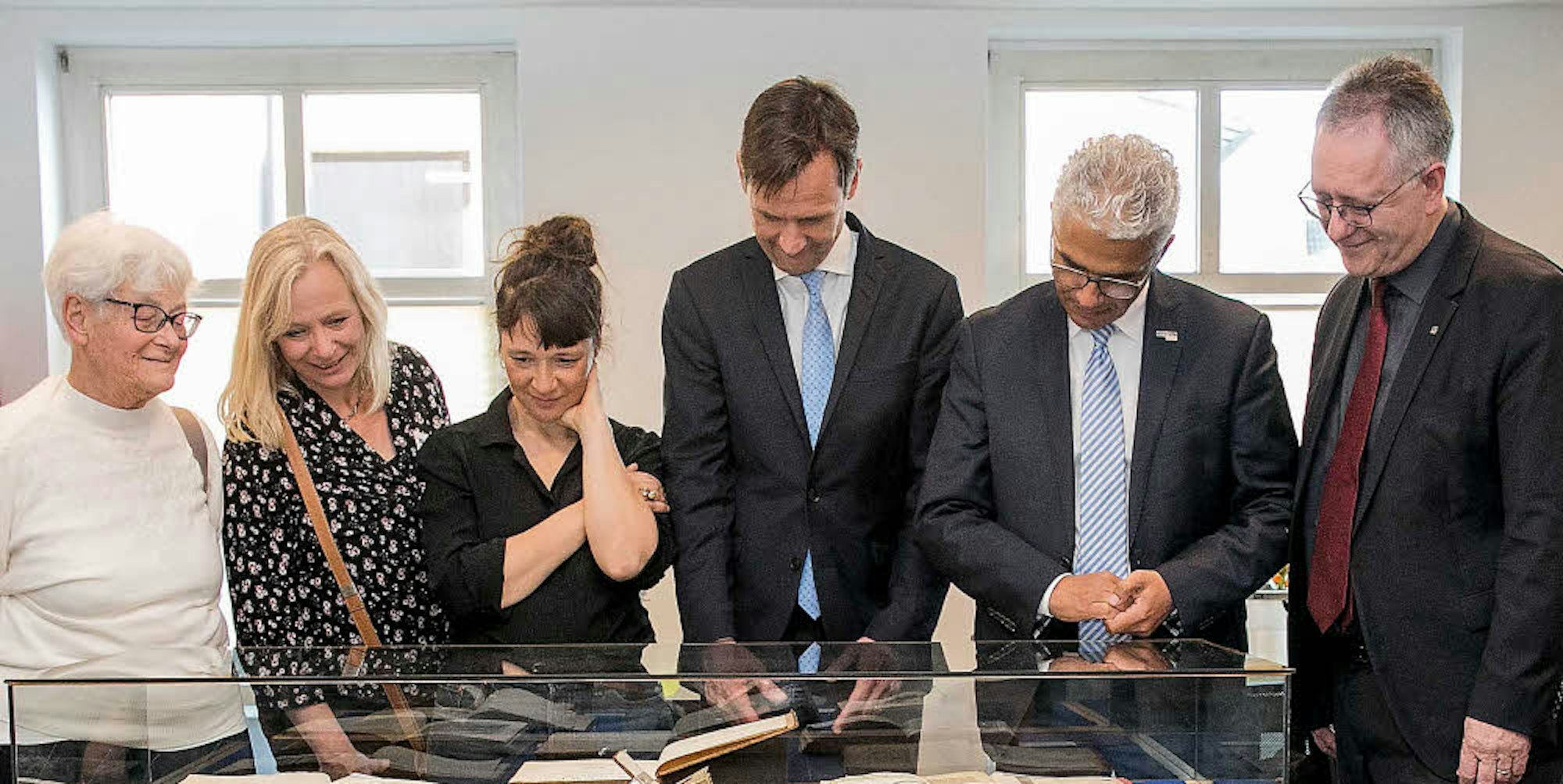 Die historischen Bücher schauten sich Tania Gregoire, Birgit Schaper (Abteilung Handschriften), Natascha Cadonici, Dr. Ulrich Meyer-Doerpinghaus, Ashok Shirdharan und Michael Hoch (v. l.) an.