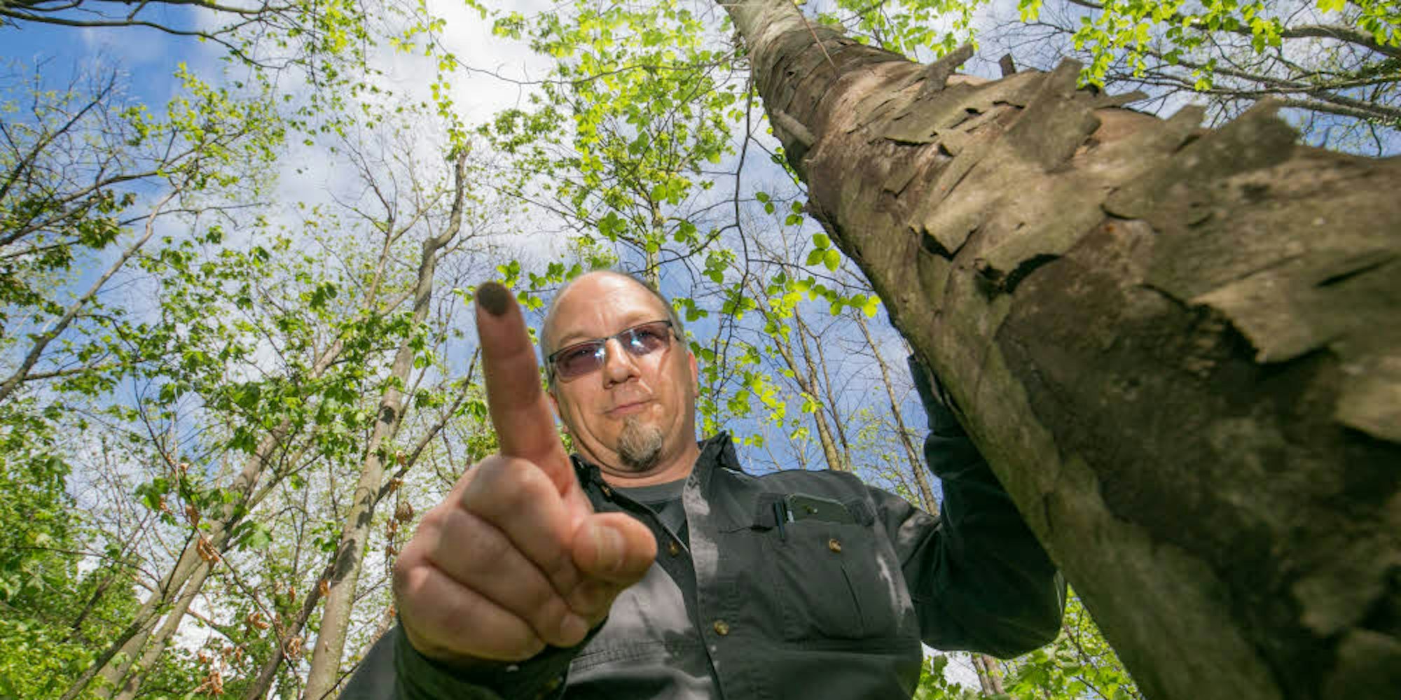Baumexperte Detlev Schröter zeigt am rechtsrheinischen Rheinufer unweit der Südbrücke einen kranken Bergahorn.