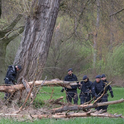 Polizisten einer Einsatzhundertschaft bei der Spurensuche in der Siegaue.