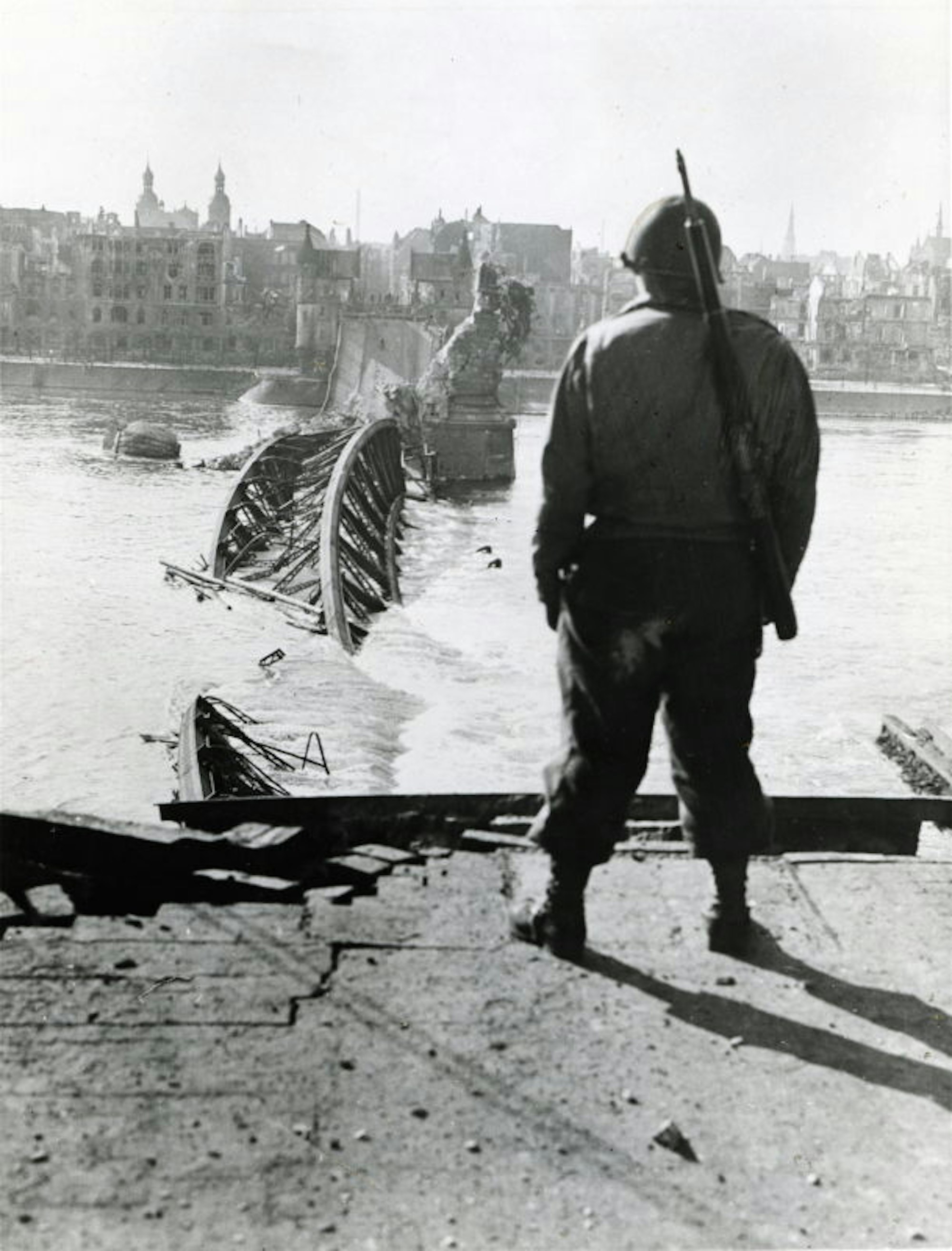 Ein amerikanischer Soldat steht am Brassertufer an der zerstörten alten Rheinbrücke.